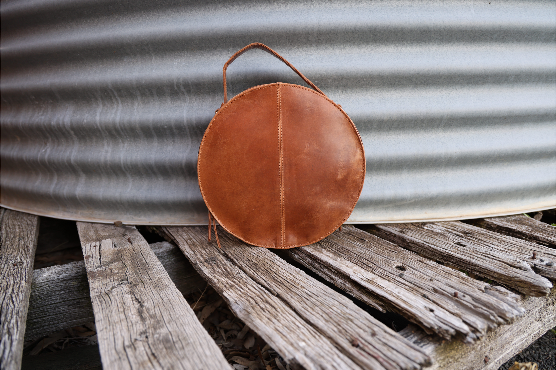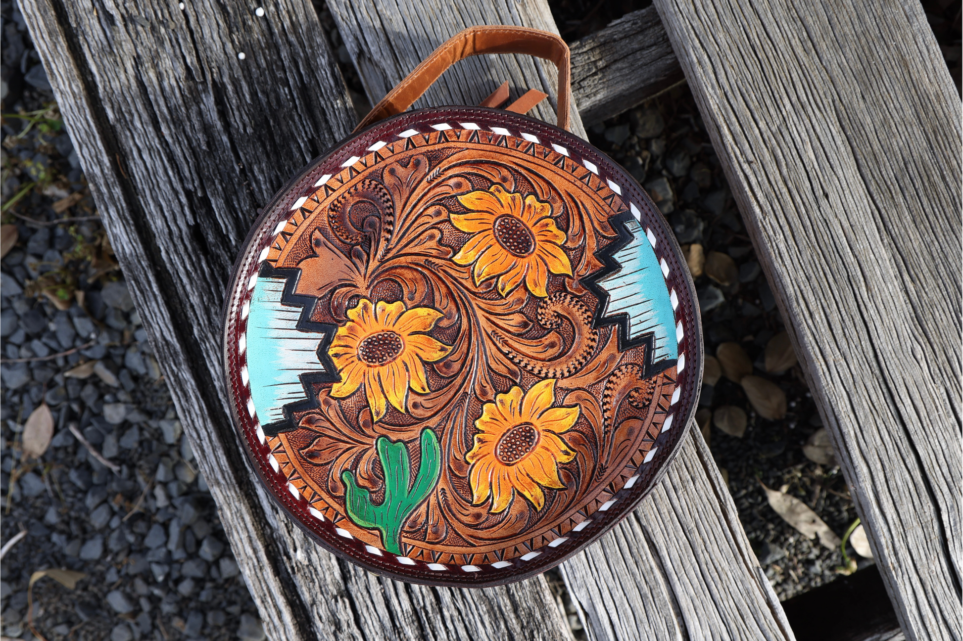 Bring the Southwest sunshine wherever you go with this one-of-a-kind Hand-Tooled Leather Round Bag, bursting with vibrant character and craftsmanship. The front features an intricately carved sunflower design, highlighted with hand-painted turquoise, green, and orange accents for a bold pop of color. The tooled pattern is framed with whipstitch edging and a deep brown border, adding dimension and durability.