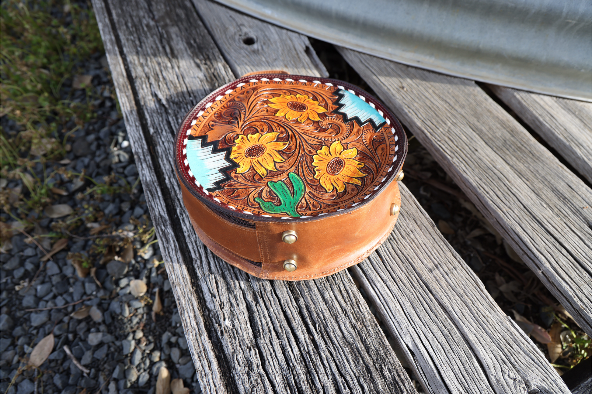Amy Sunflower Hand Tooled Round Canteen Bag