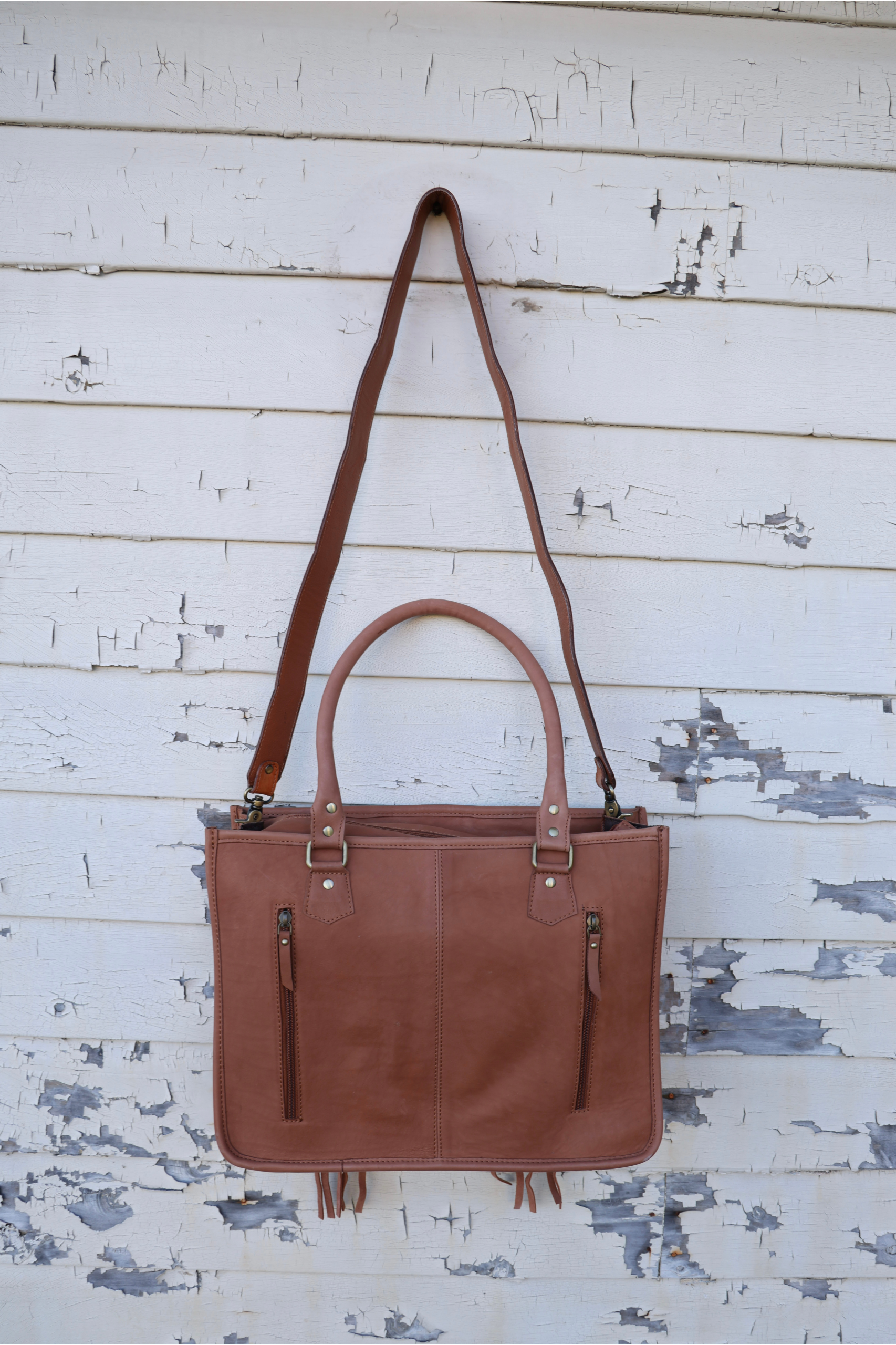 Long leather fringe adds movement and character, while the dual carrying options—sturdy rolled handles and an adjustable, removable shoulder strap—make it as functional as it is eye-catching. The back of the bag features two vertical zippered pockets for easy access to essentials, while the spacious interior offers plenty of room for your daily carry.