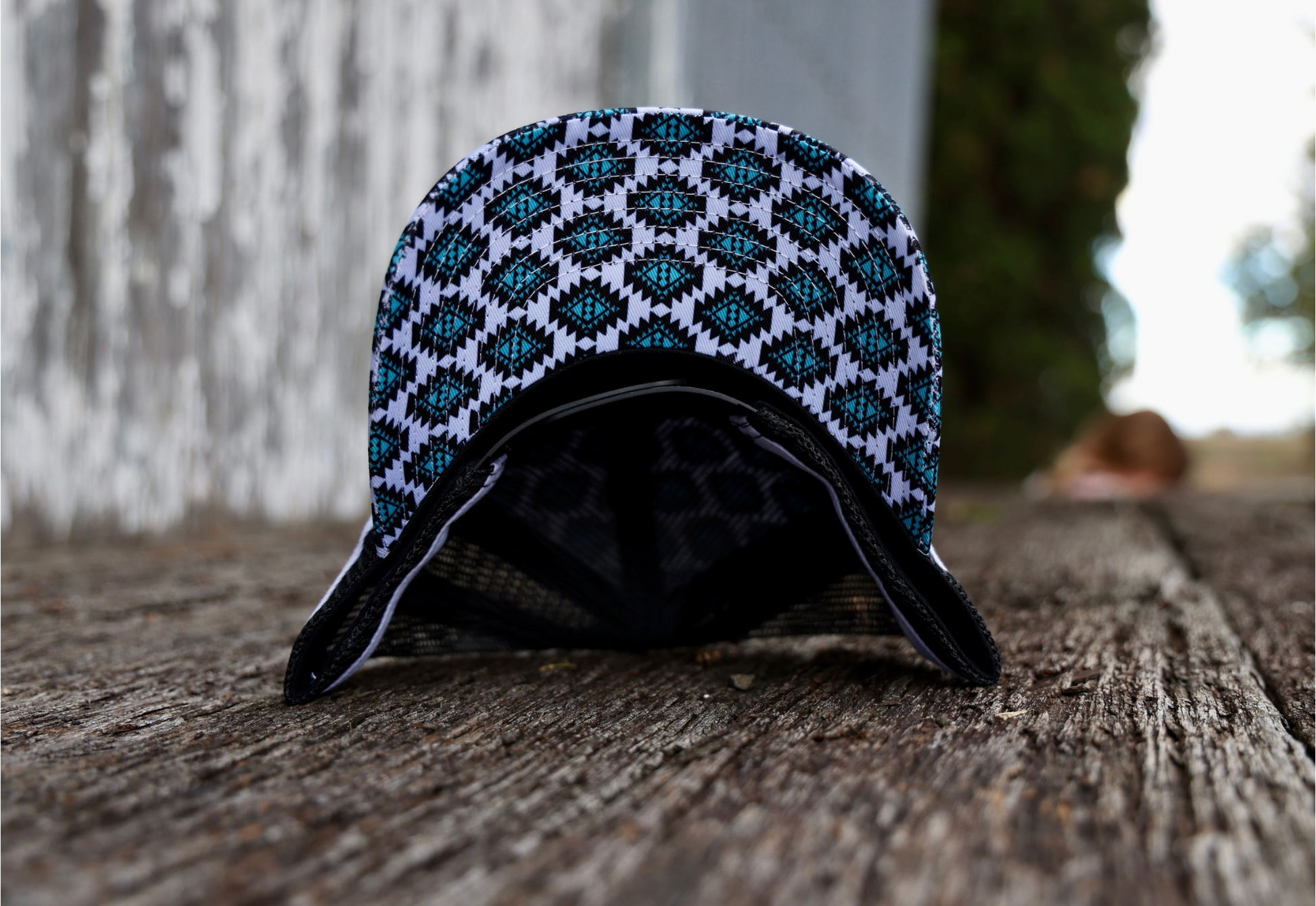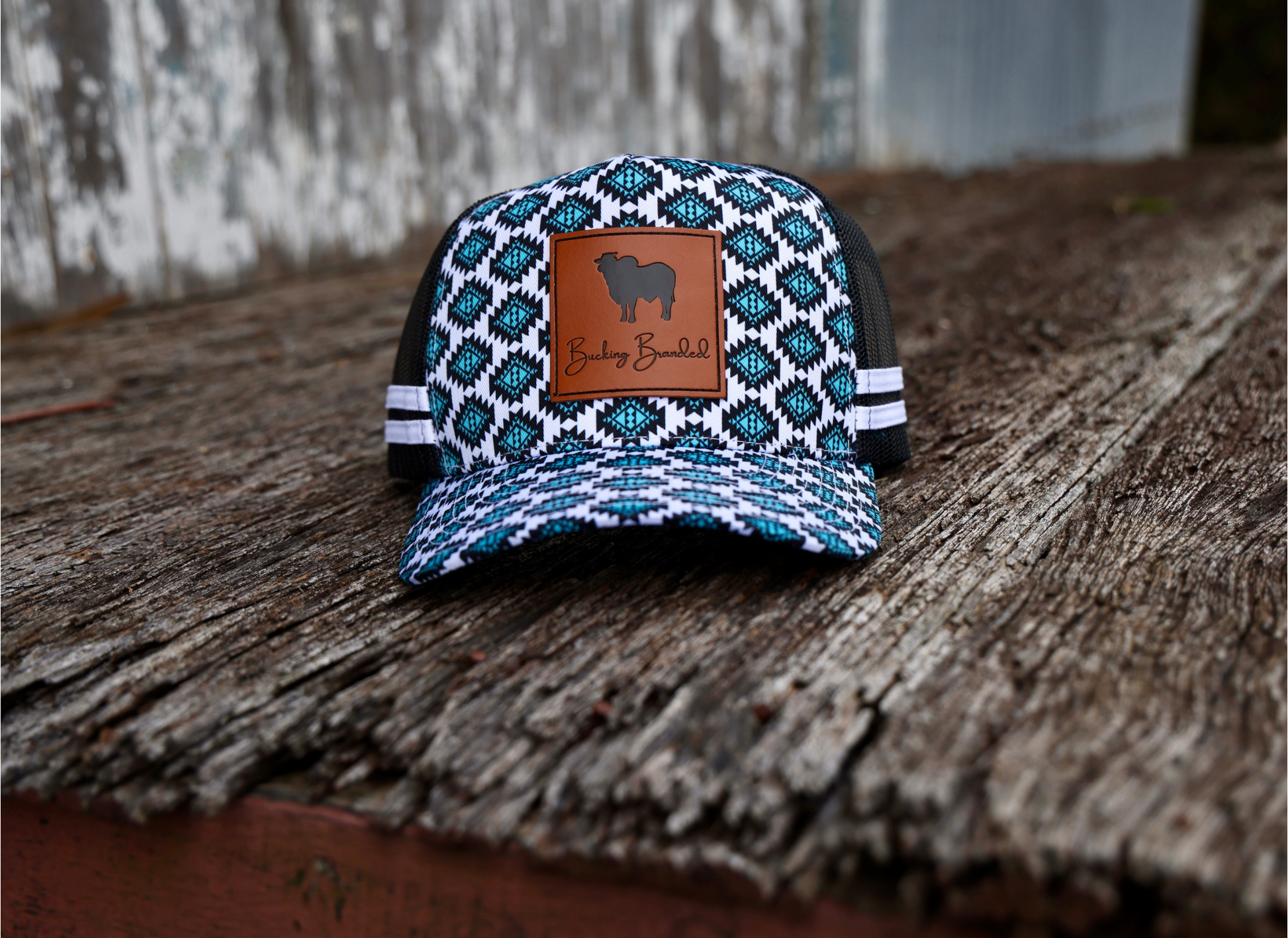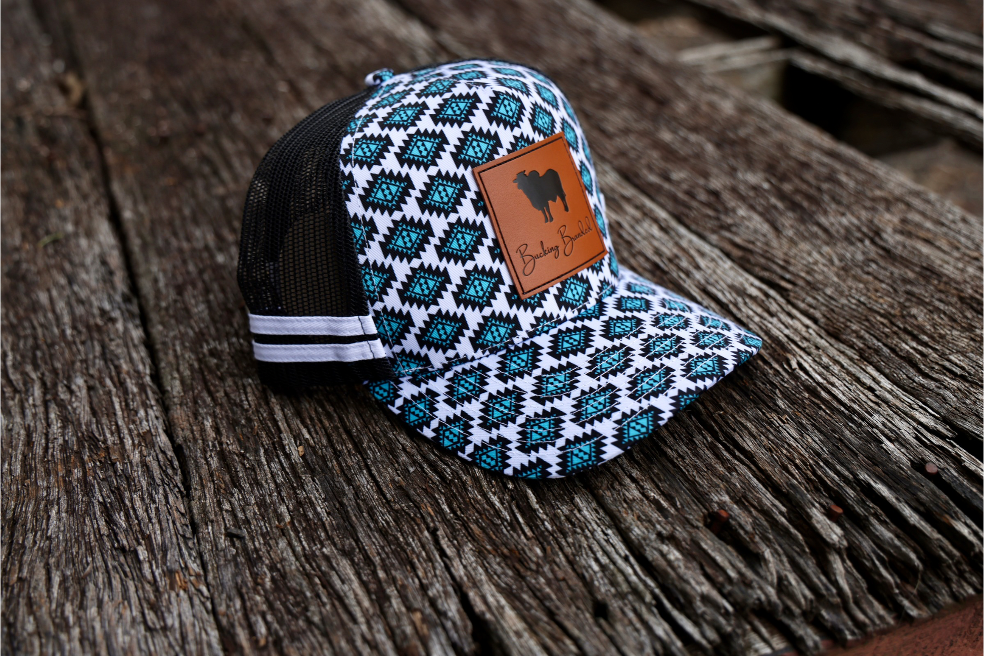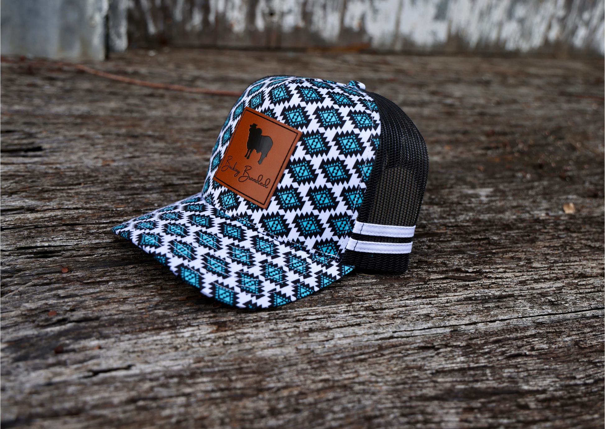 Stand out from the herd in the Aztec Brahman Trucker Cap by Bucking Branded. Featuring a bold turquoise-and-black Aztec pattern across the crown and bill, this cap is topped with a premium faux leather patch showcasing a silhouette of a Brahman — the wildest of them all.