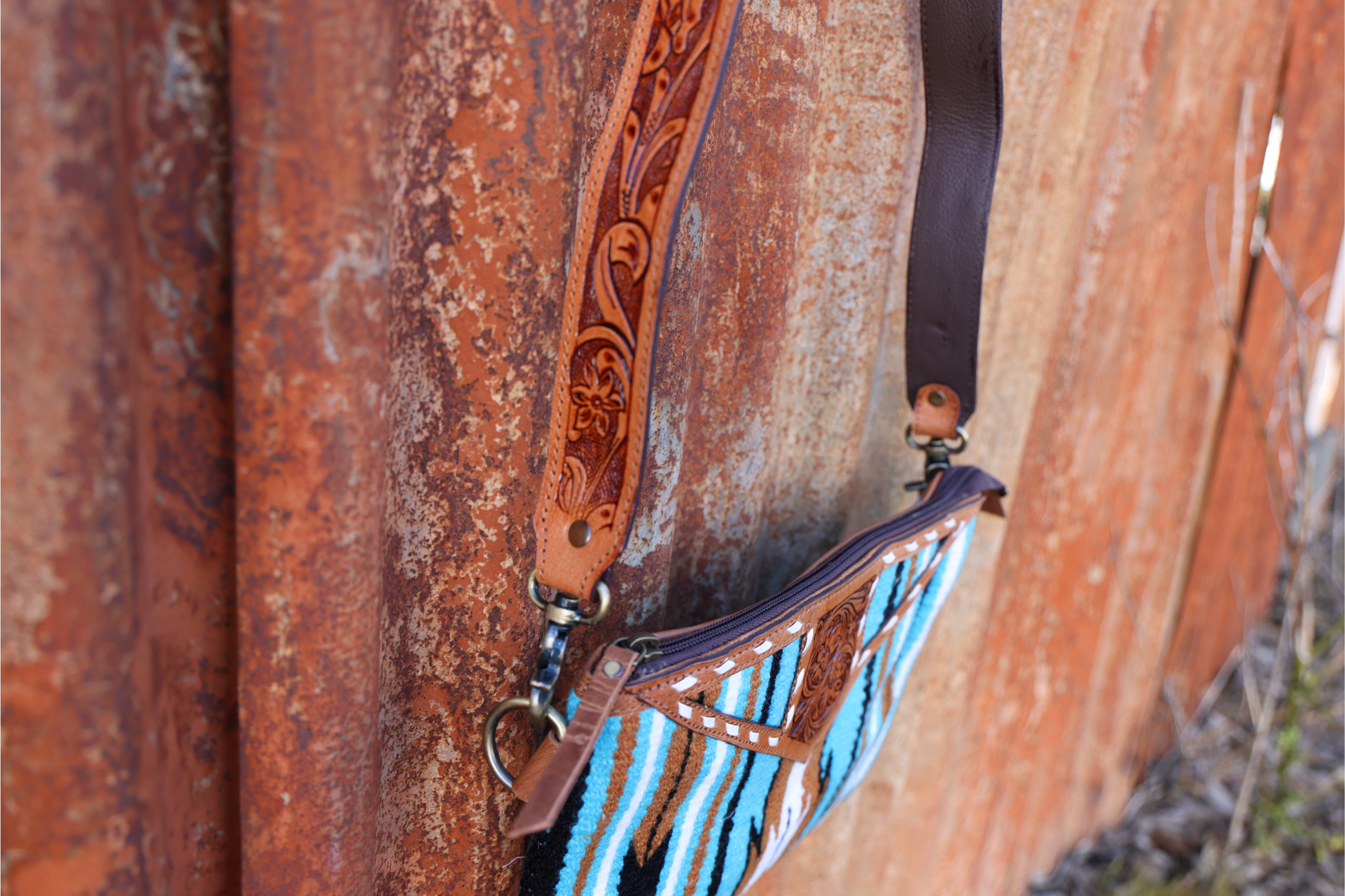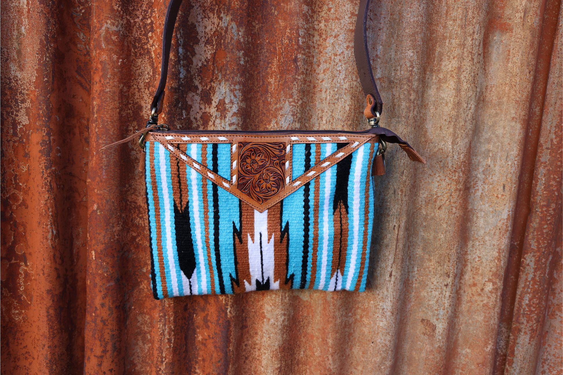 Elevate your everyday style with our handcrafted Saddle Blanket Crossbody Bag, featuring bold turquoise, black, rust, and white woven fabric and a genuine tooled leather accent flap. Inspired by traditional serape patterns and Western charm, this bag is designed for fashion-forward function.