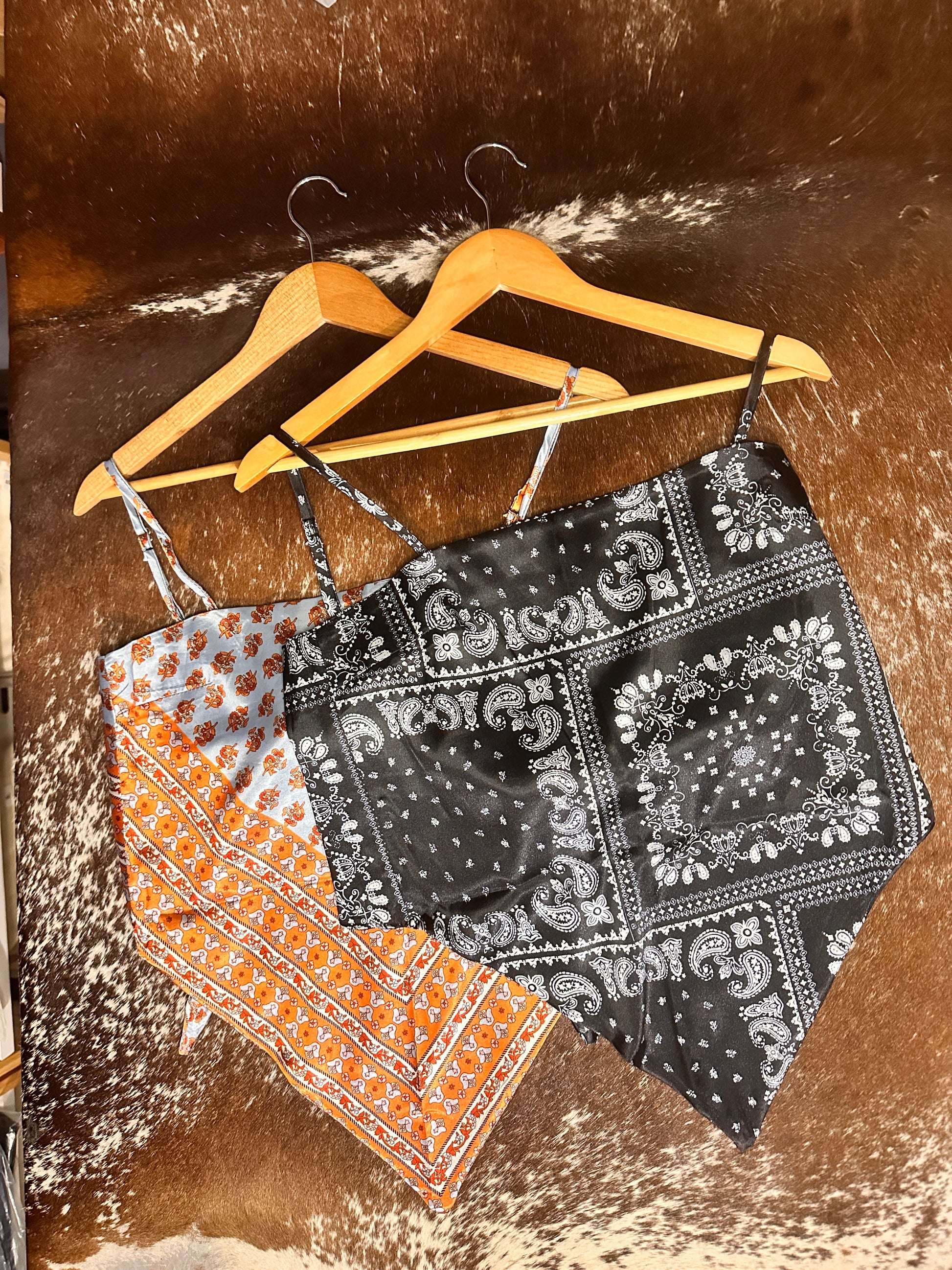 Turn heads with this edgy-meets-western bandana cami top, designed for both comfort and style. Made from a lightweight, breathable fabric, this top features a flattering handkerchief hemline and adjustable tie-back closure for the perfect fit every time.