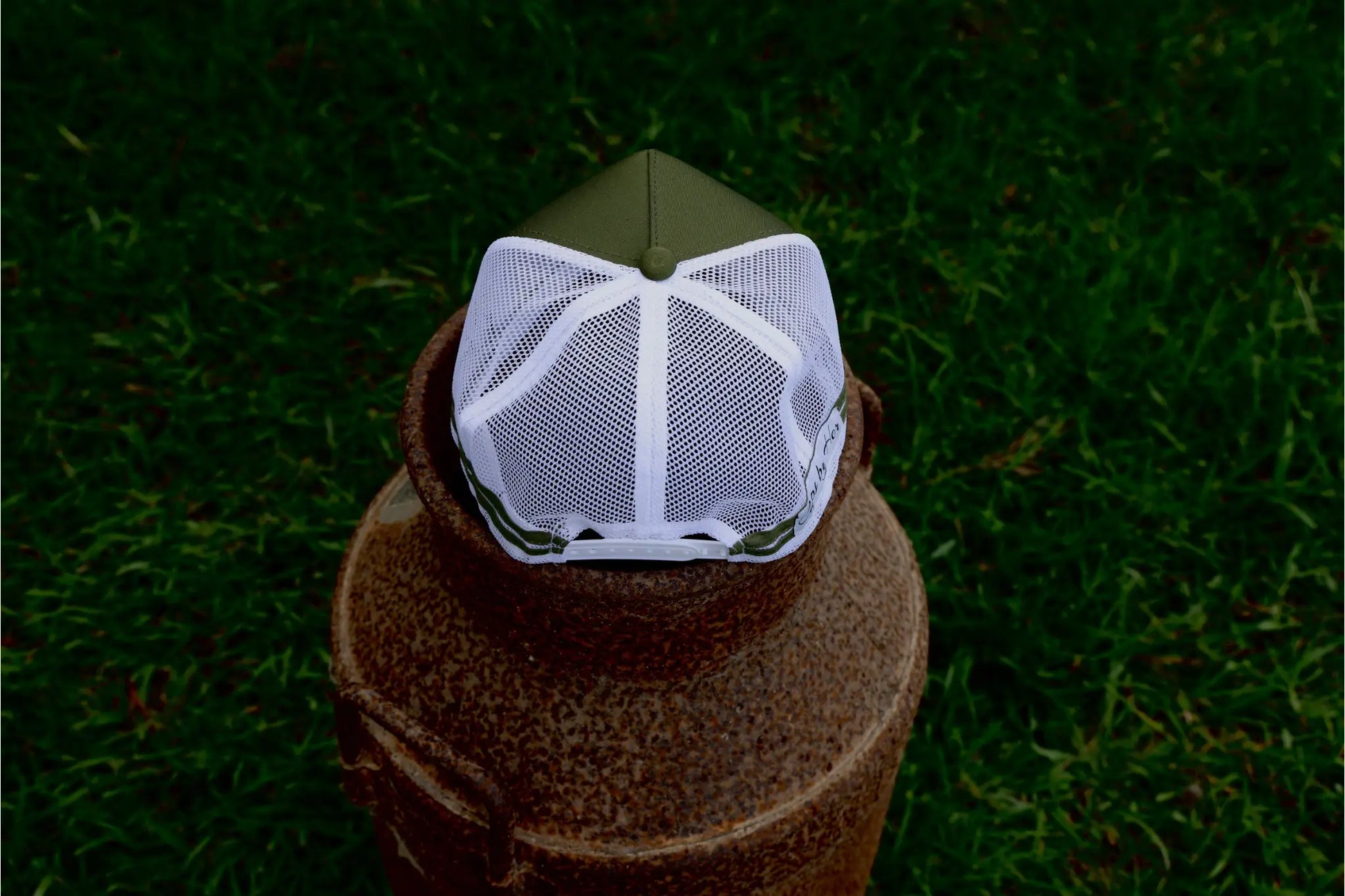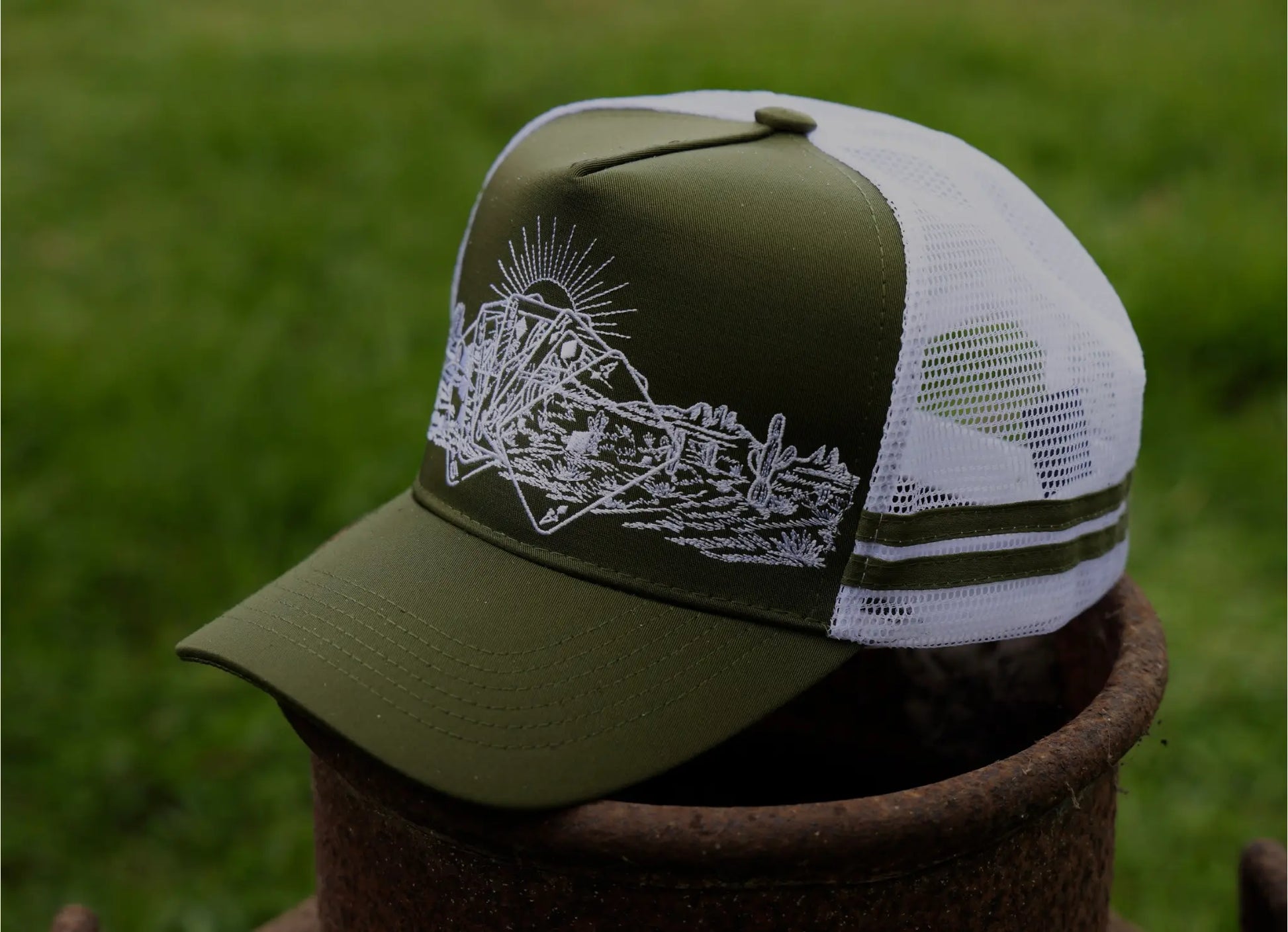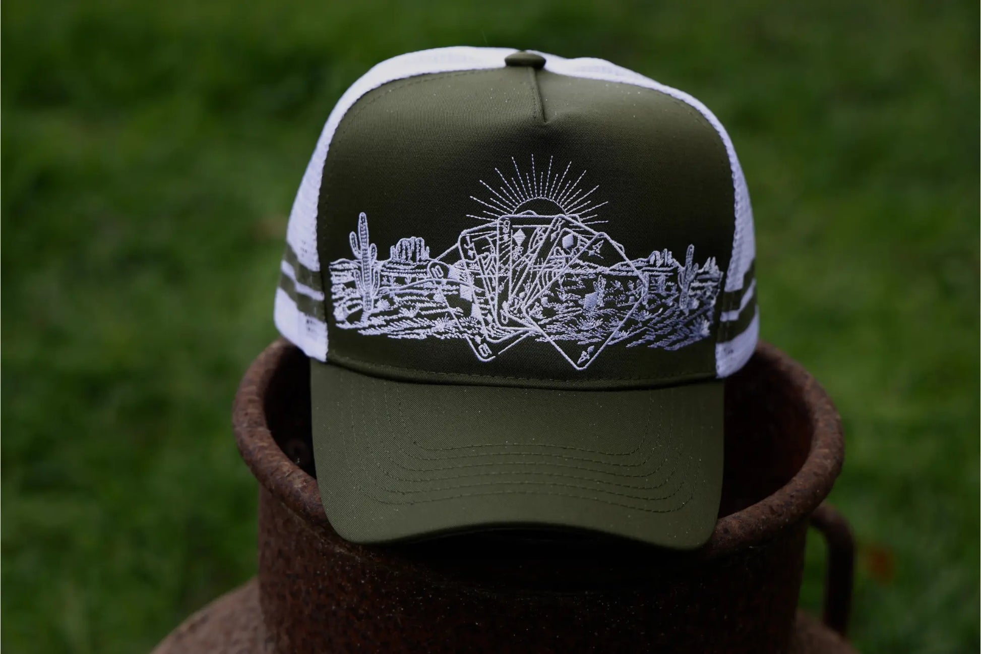 Hit the road in style with the Desert Sunrise Trucker Cap — where rugged adventure meets classic cool. Featuring an olive green front with crisp white mesh backing, this cap keeps you cool while turning heads. The front panel showcases a detailed embroidered design of a desert landscape at sunrise, complete with iconic saguaro cacti, red rock formations, and a clever touch of playing cards subtly woven into the scene for a dash of personality.