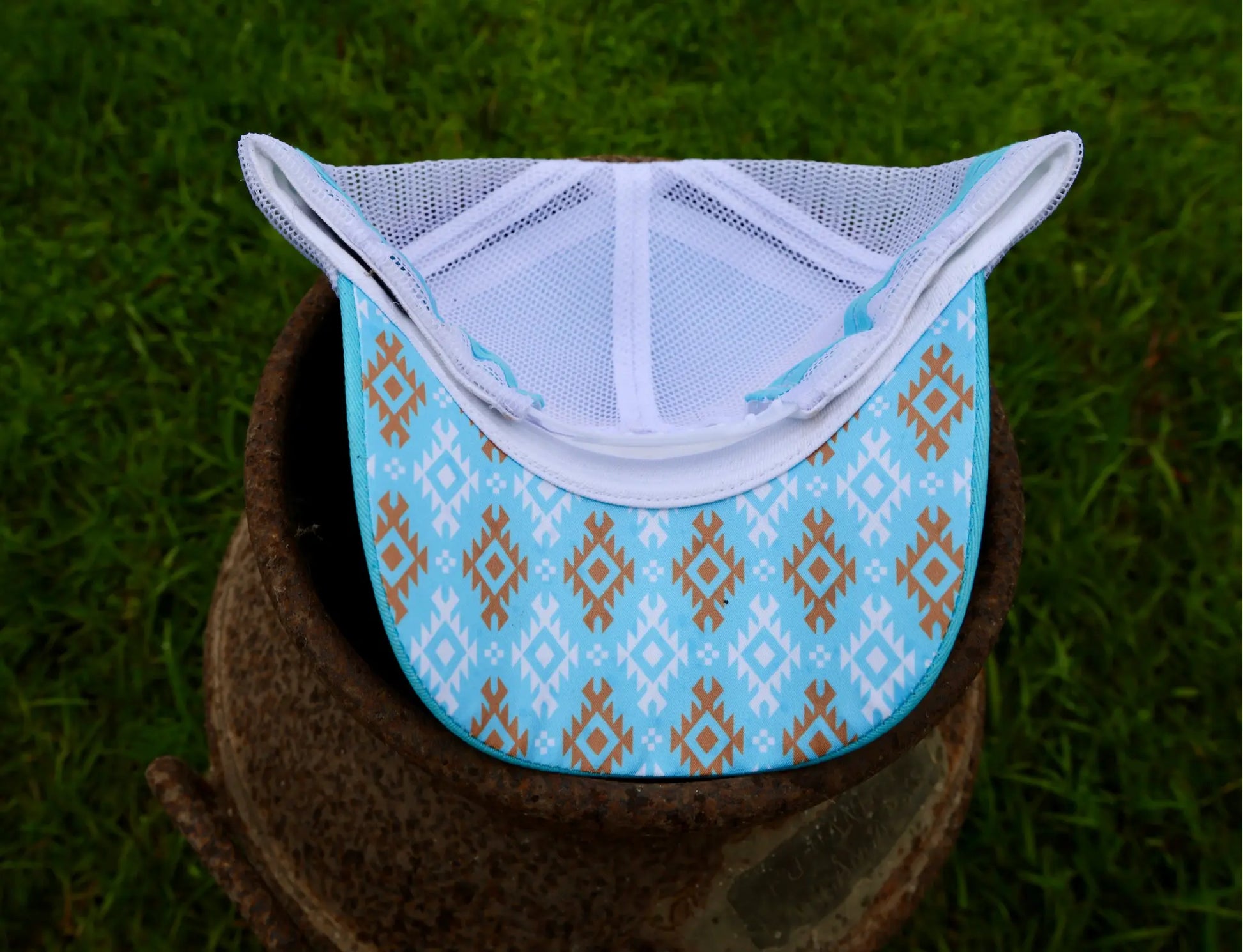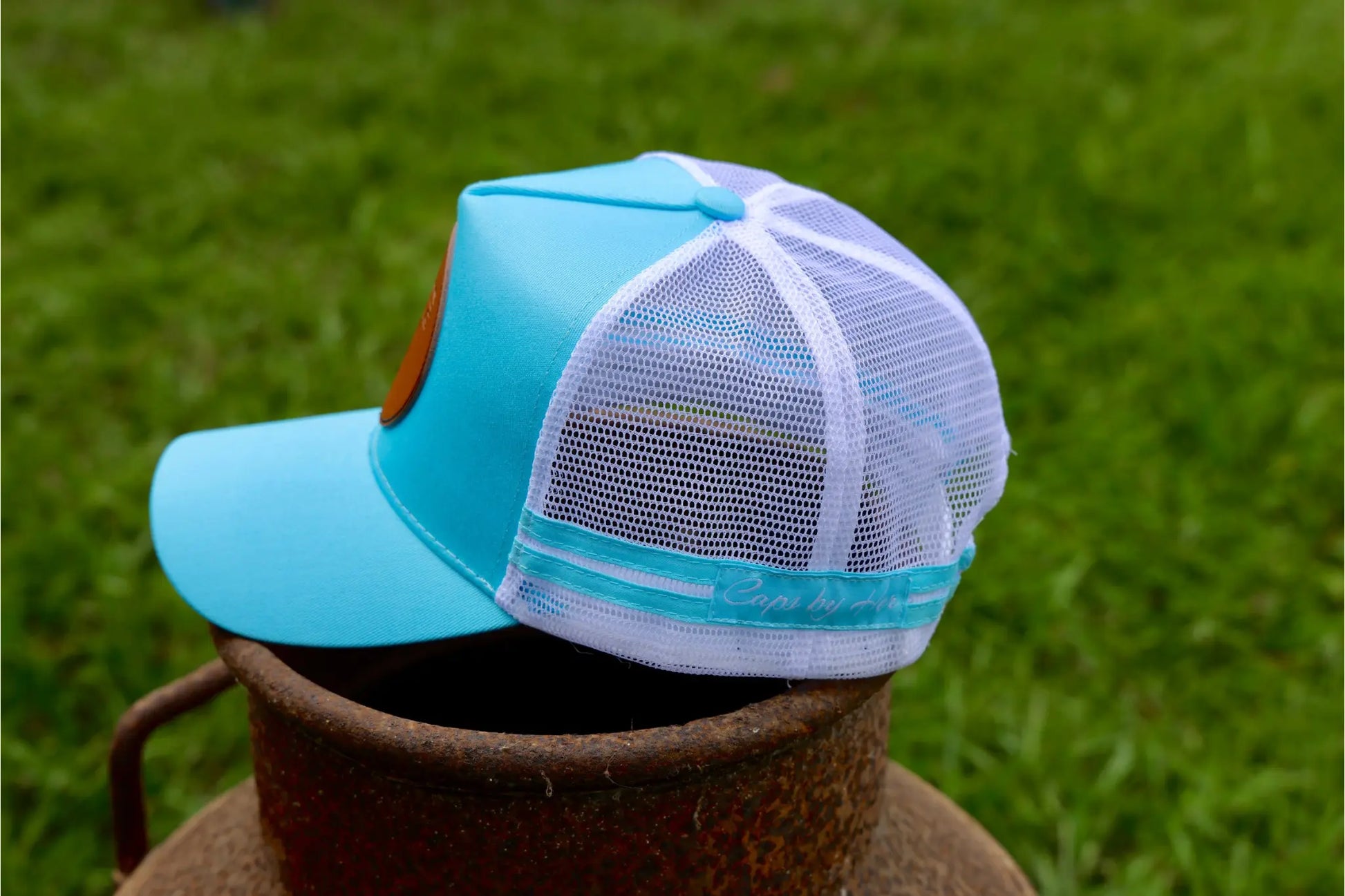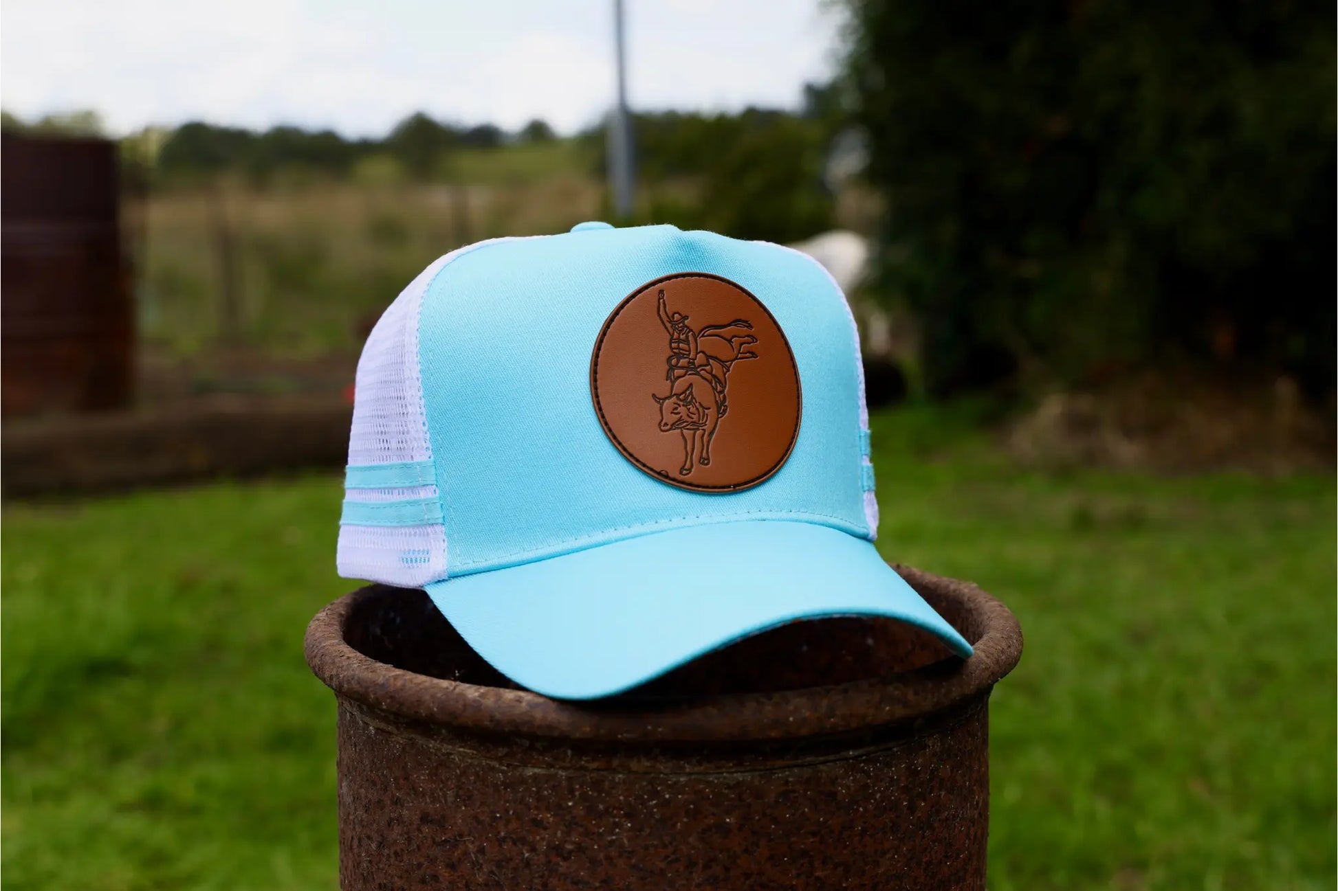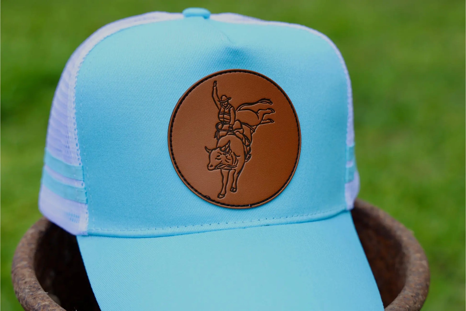 Saddle up in standout style with the Buck ‘Em Blue Trucker Cap. Featuring a vibrant sky-blue front and bill, this cap is centered with a bold faux leather patch embossed with a bull rider mid-ride—capturing the grit, glory, and freedom of rodeo life. The crisp white mesh back with light blue side stripes offers classic contrast and breathable comfort. Whether you’re in the arena or just living that western lifestyle, this hat keeps you cool and cowboy proud.