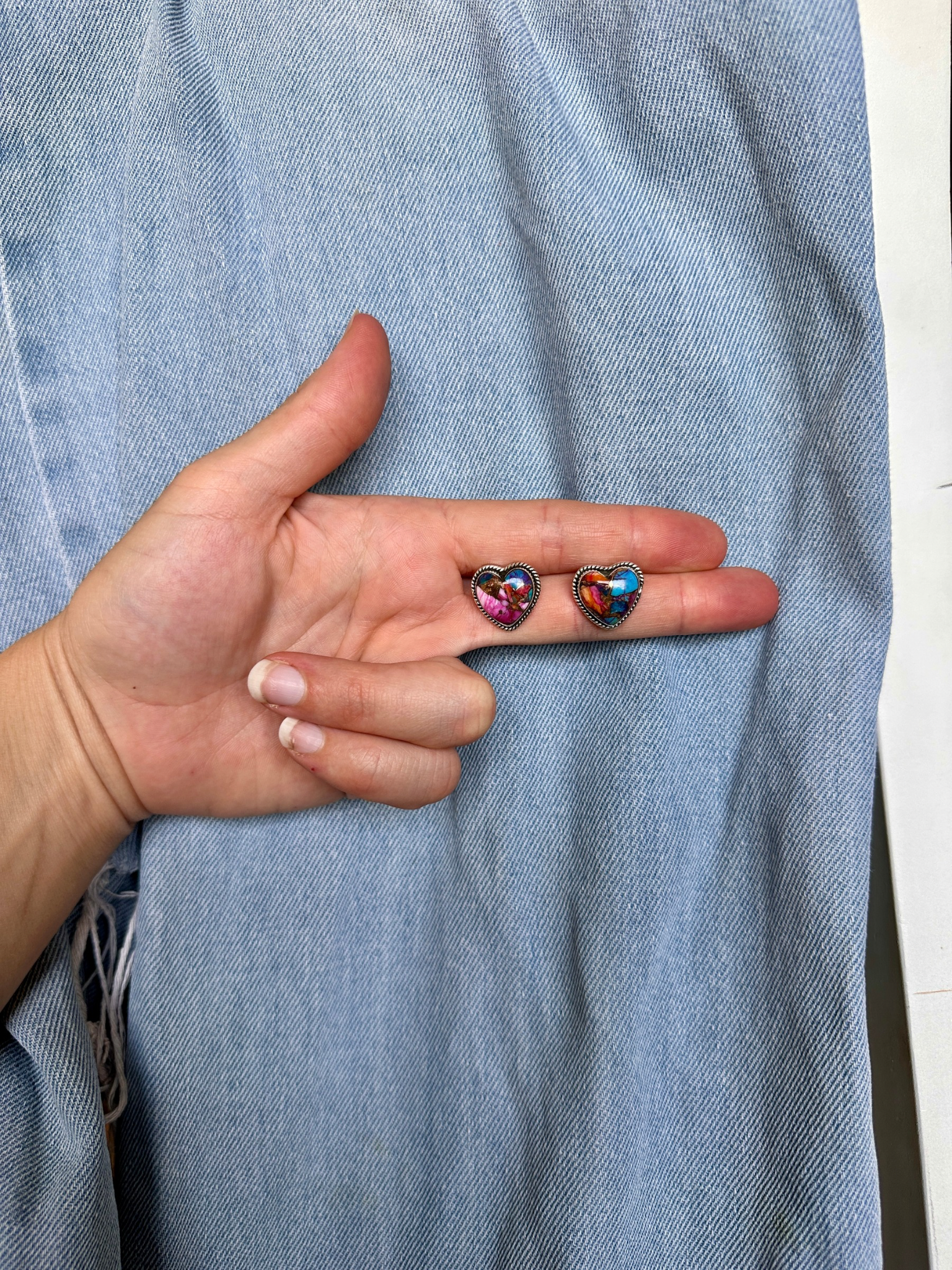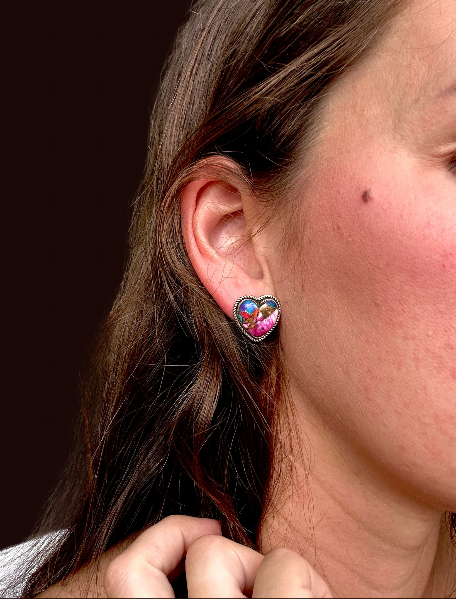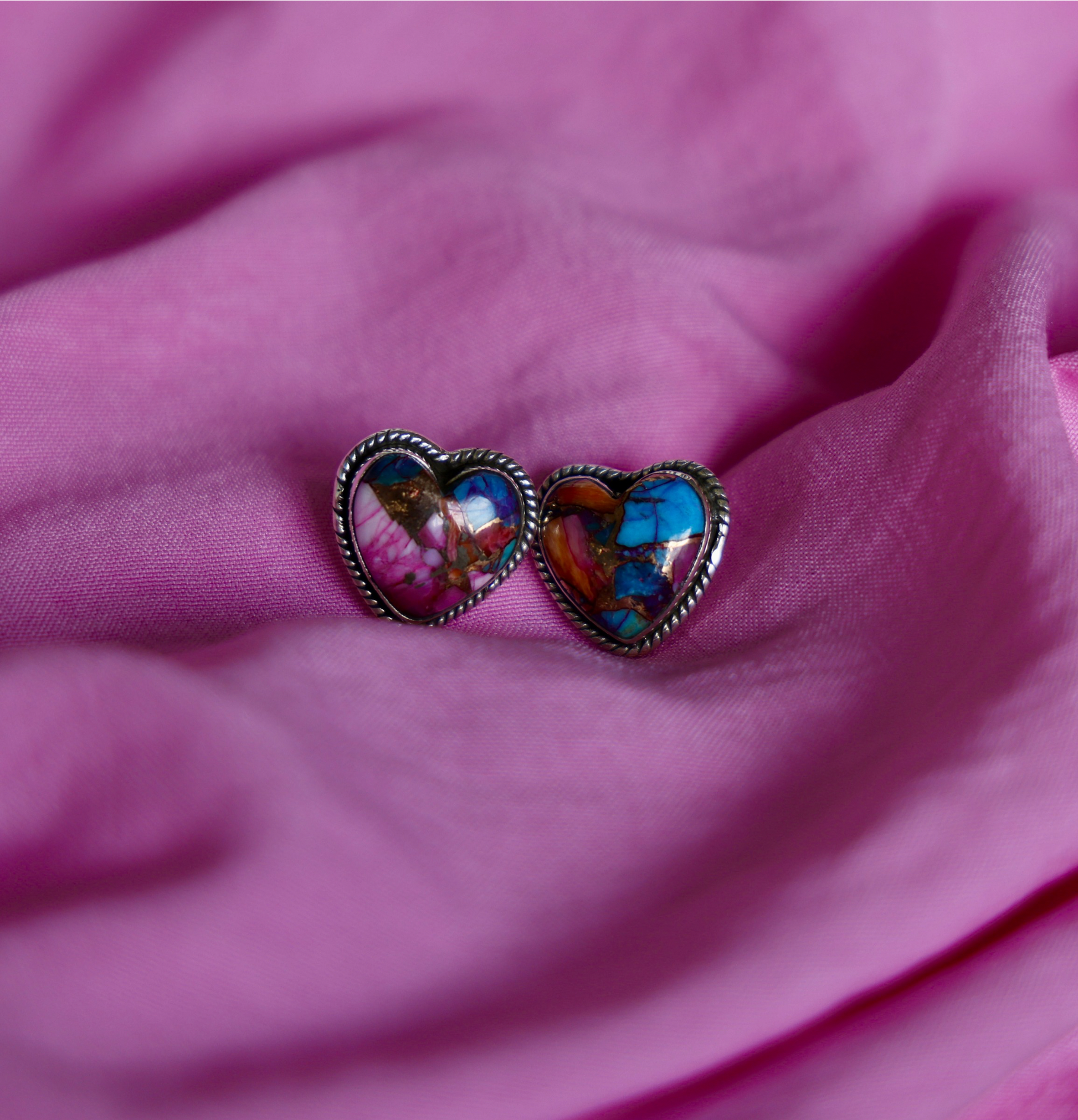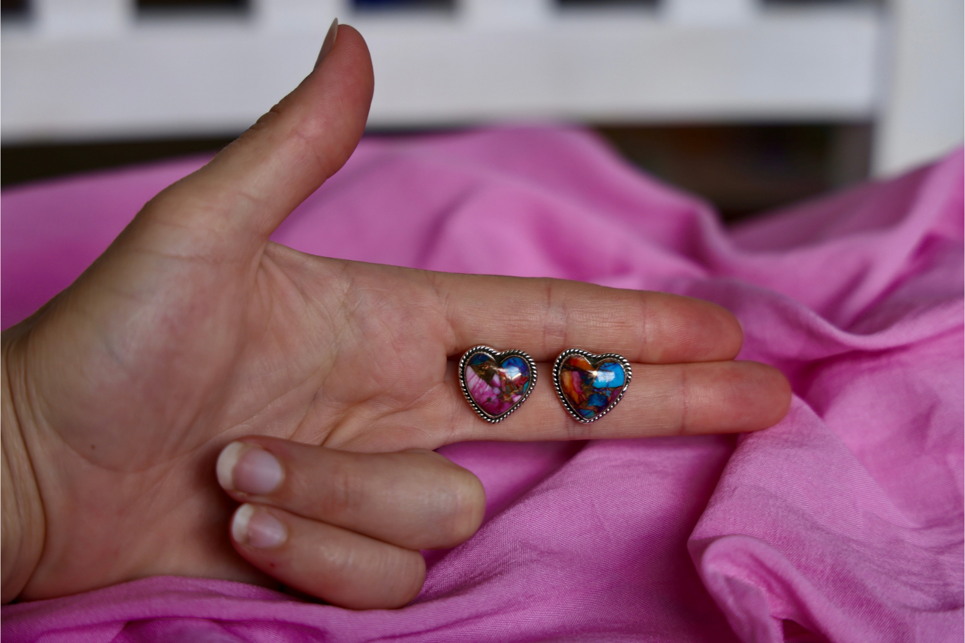 Add a bold pop of colour and charm to your everyday style with these stunning Spiny Oyster heart earrings, handcrafted with genuine .925 sterling silver. Each pair showcases a vibrant, one-of-a-kind mix of spiny oyster shell and turquoise tones, set in a classic heart shape with a detailed beaded silver border.