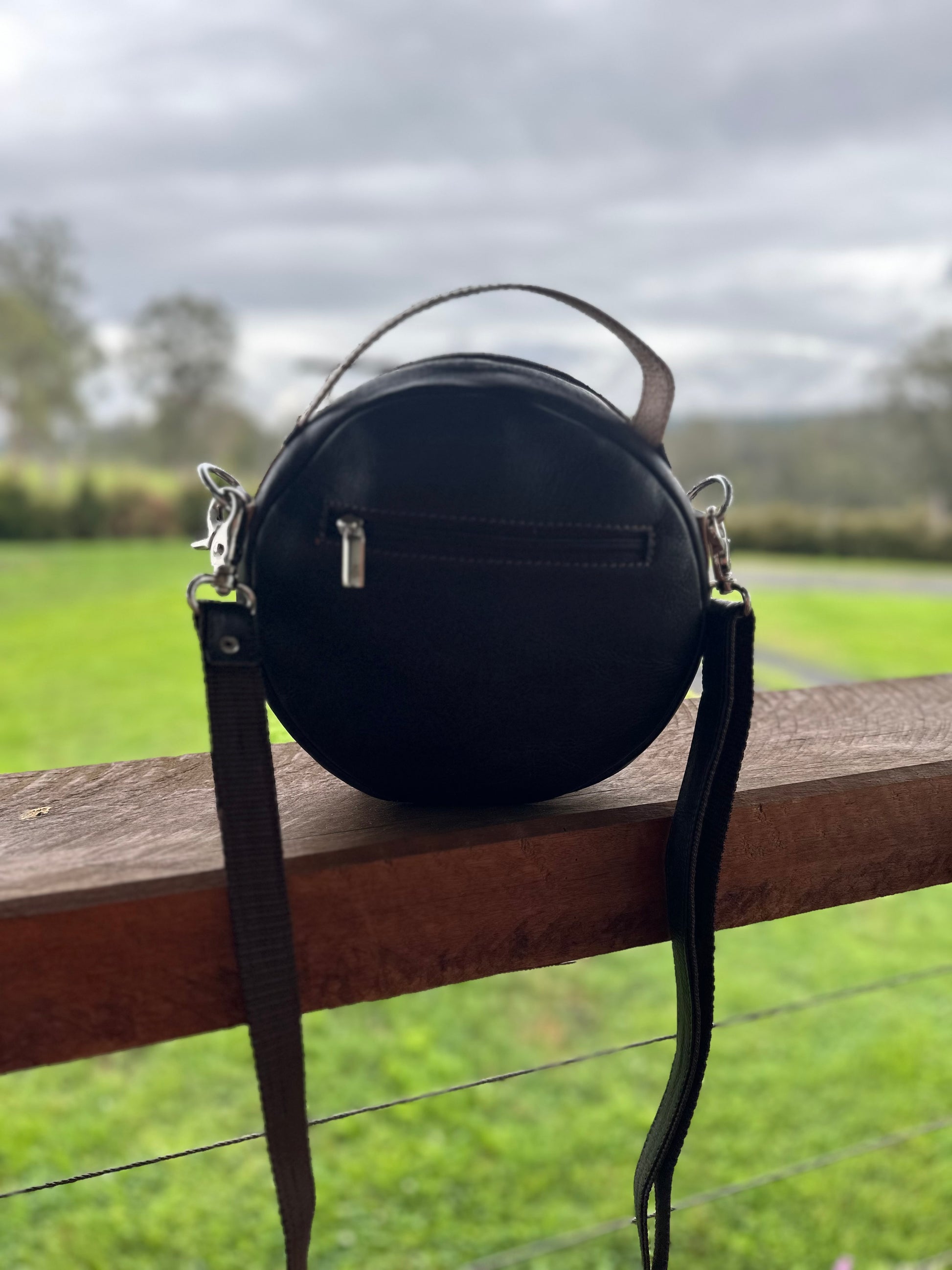 The front is bordered with silver studs and adorned with vibrant hand-painted flowers, set against deep tooled leather for a striking contrast. The back is sleek black leather, complete with a zippered pocket for easy access to essentials. Inside, you’ll find a soft, fully lined interior with an additional zippered compartment for extra organization.