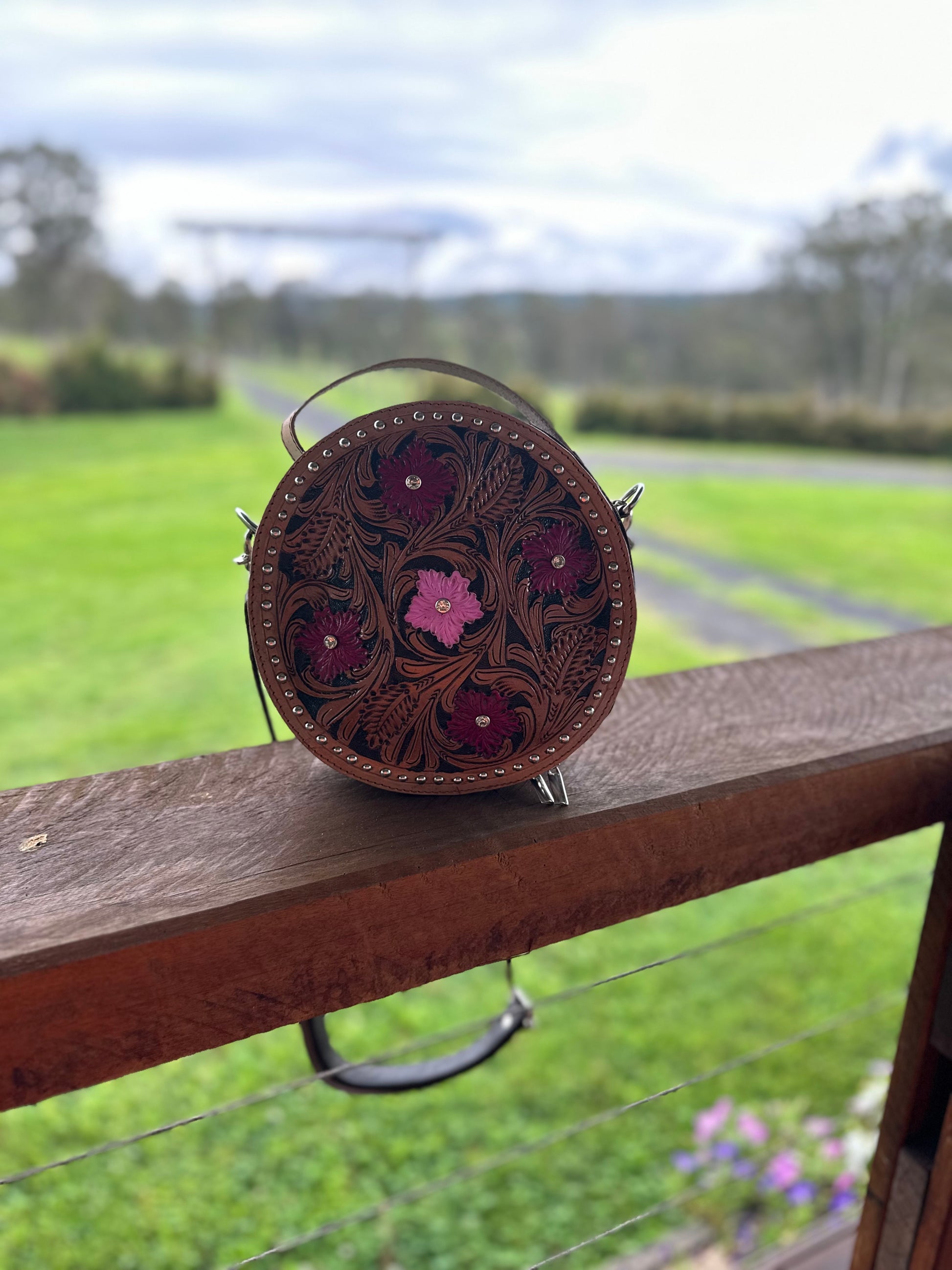 Add a pop of charm to your wardrobe with this stunning round leather shoulder bag, beautifully crafted for the bold and the stylish. Featuring intricate hand-tooled floral detailing in rich pink and maroon tones, this bag is the perfect blend of Western elegance and modern flair.