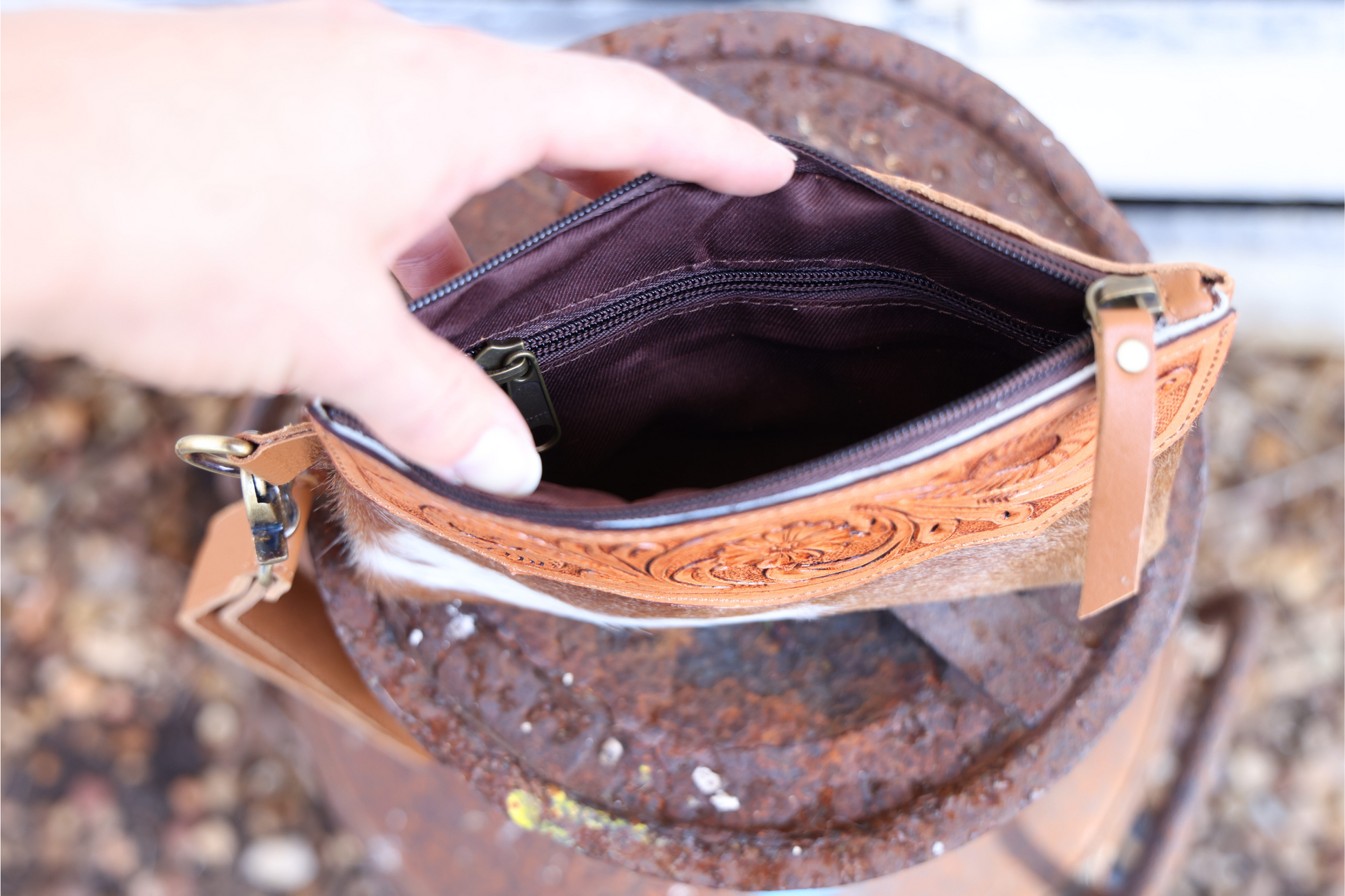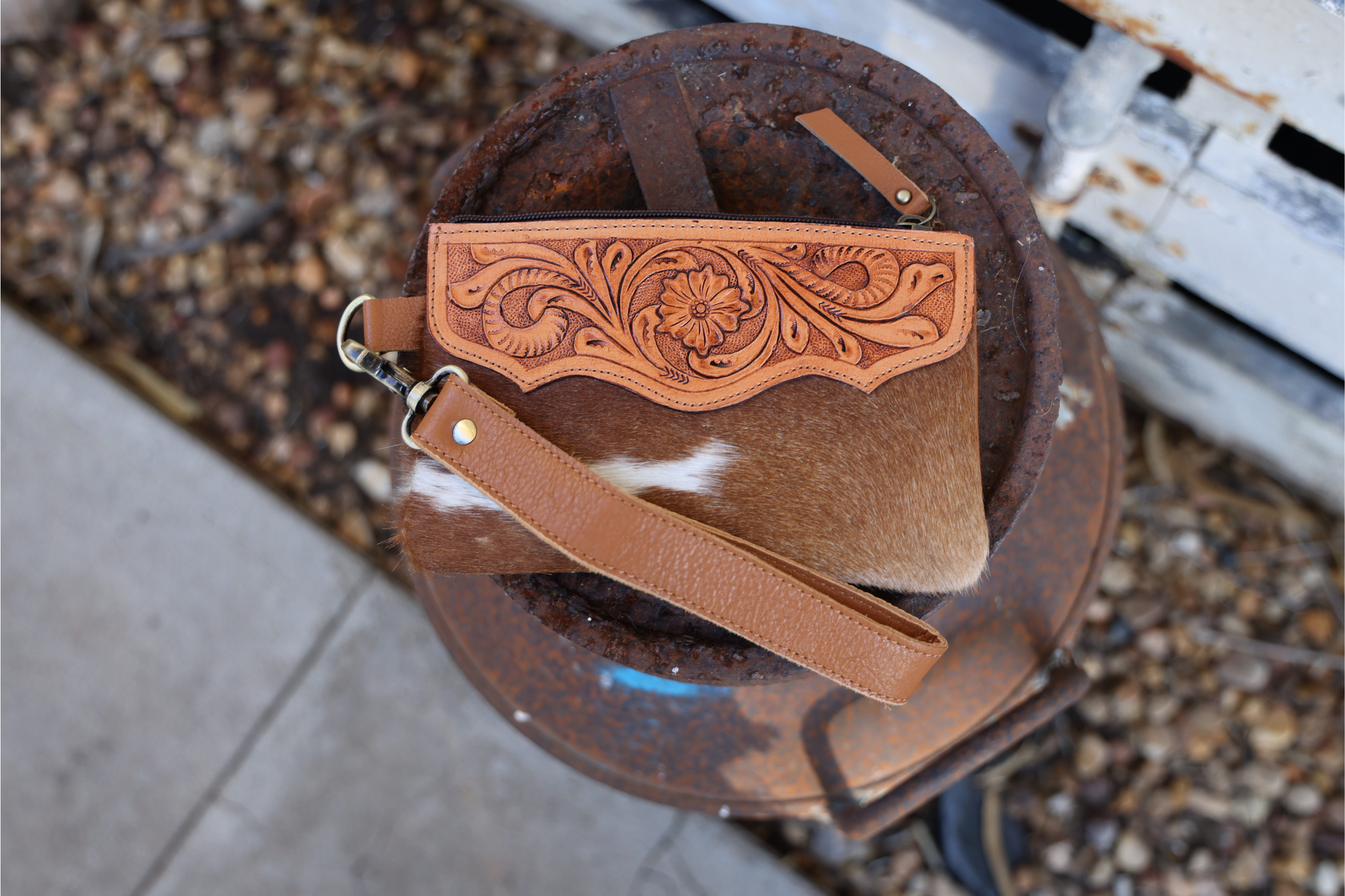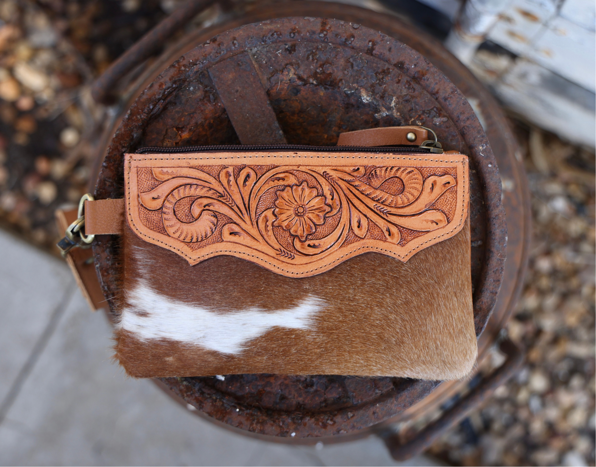 The front is adorned with a beautifully tooled floral and scroll pattern, carved into premium tanned leather for rich texture and depth. Paired with natural hair-on-hide and a detachable leather wrist strap, this piece is perfect for errands, events, or a night out on the town.