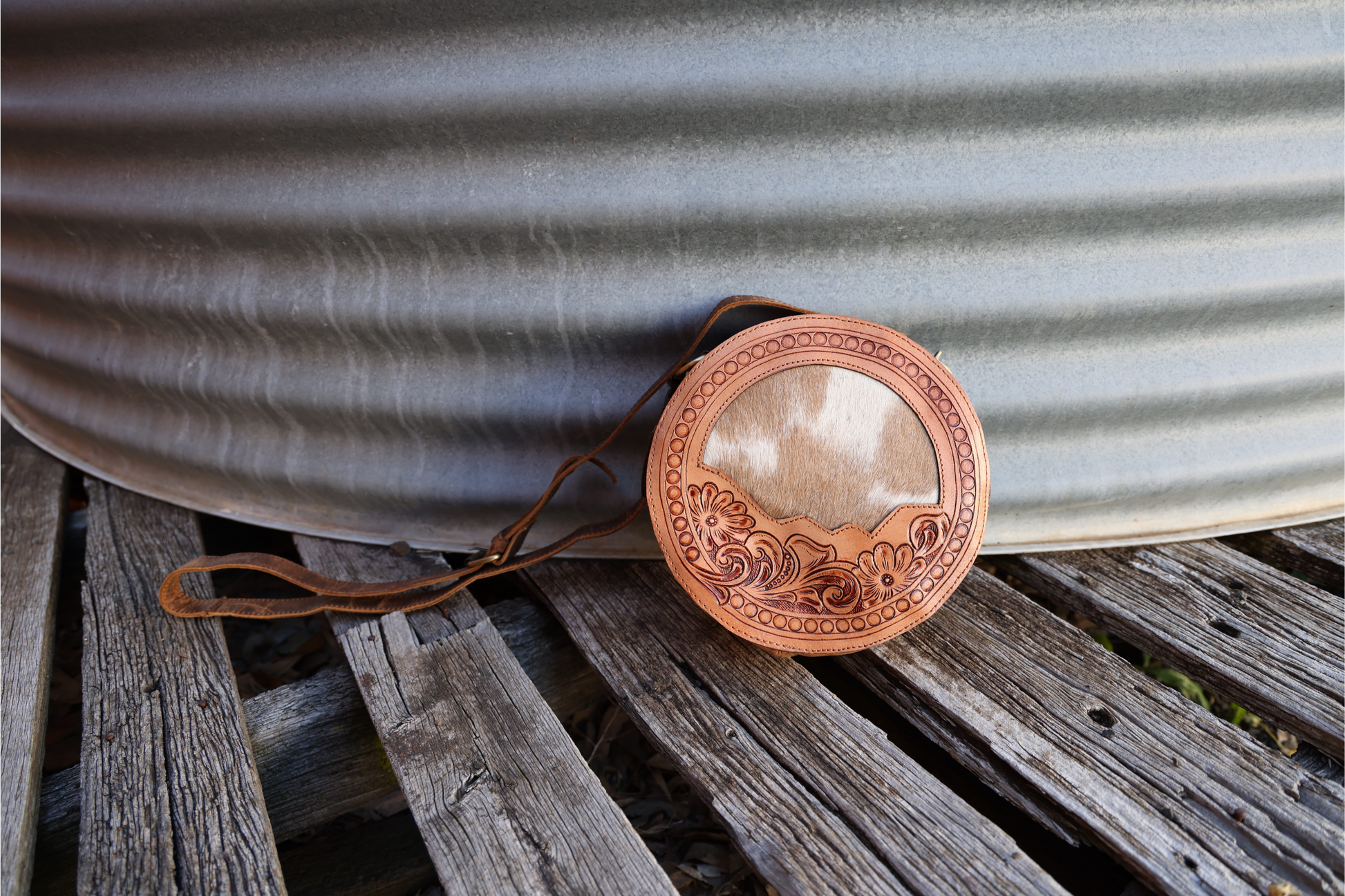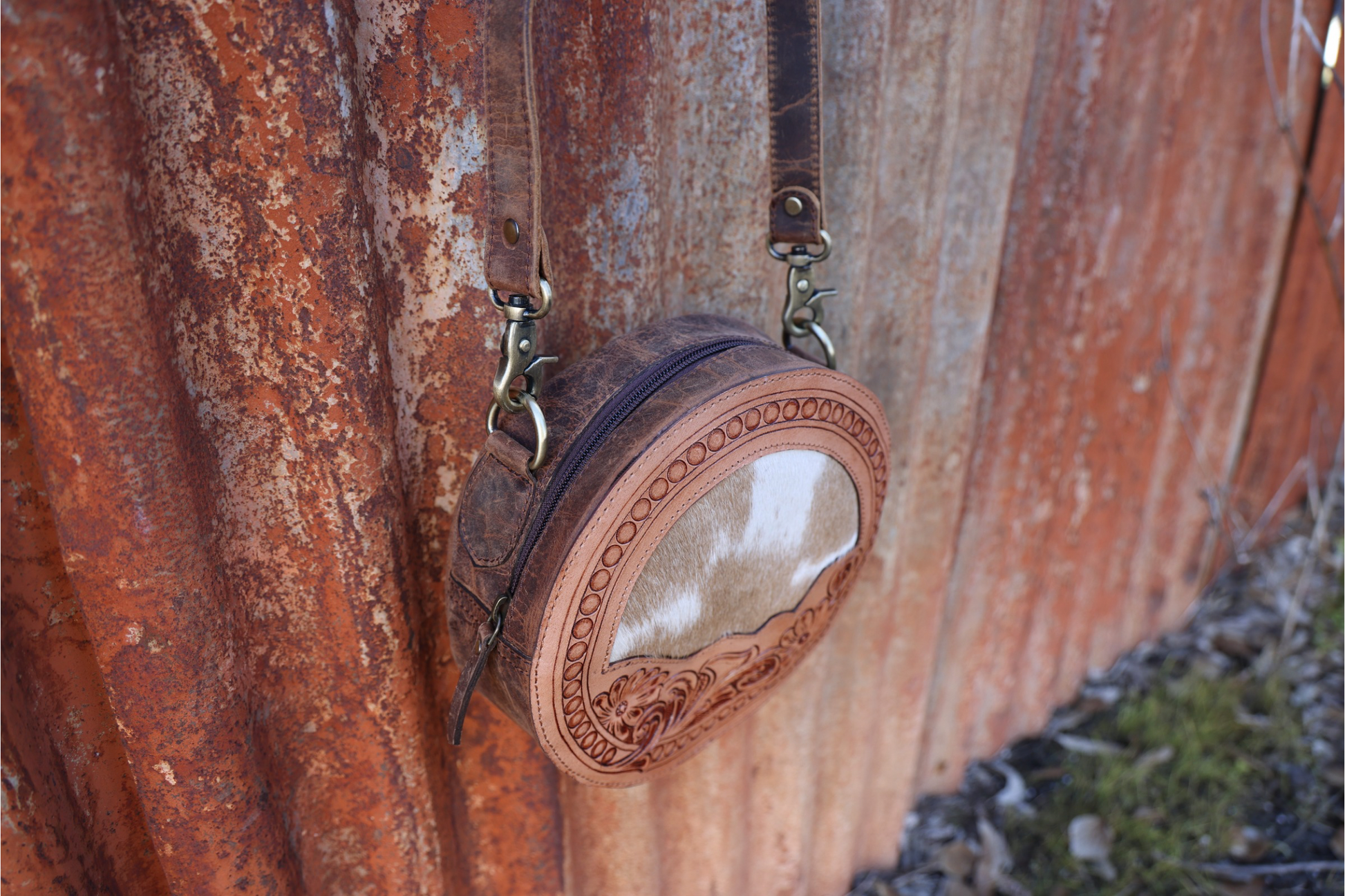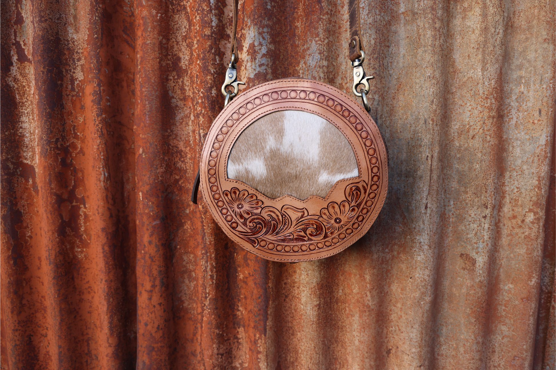 • Genuine tooled leather & hair on hide front panel