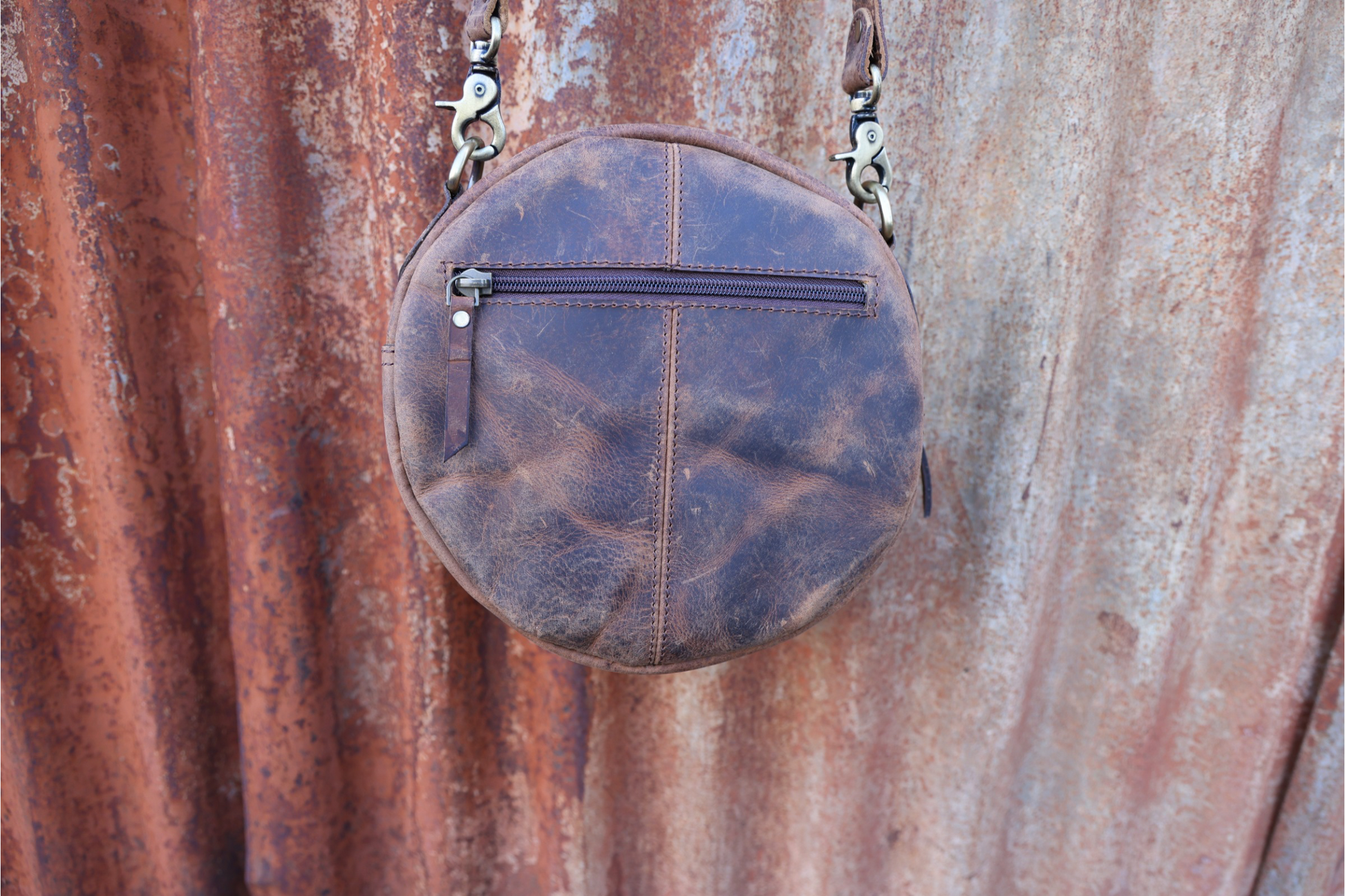 • Plain leather back panel features 1 zip pocket.