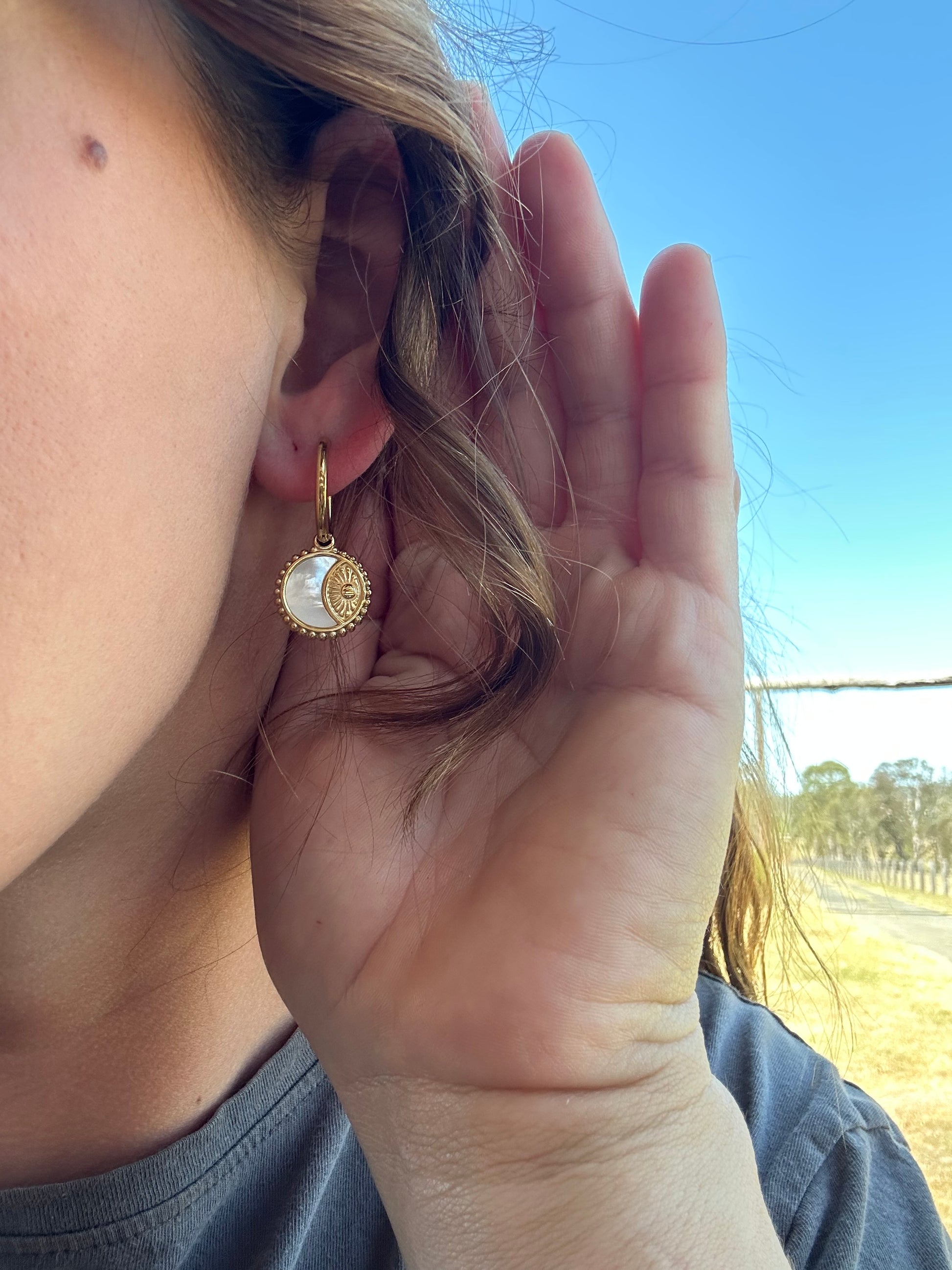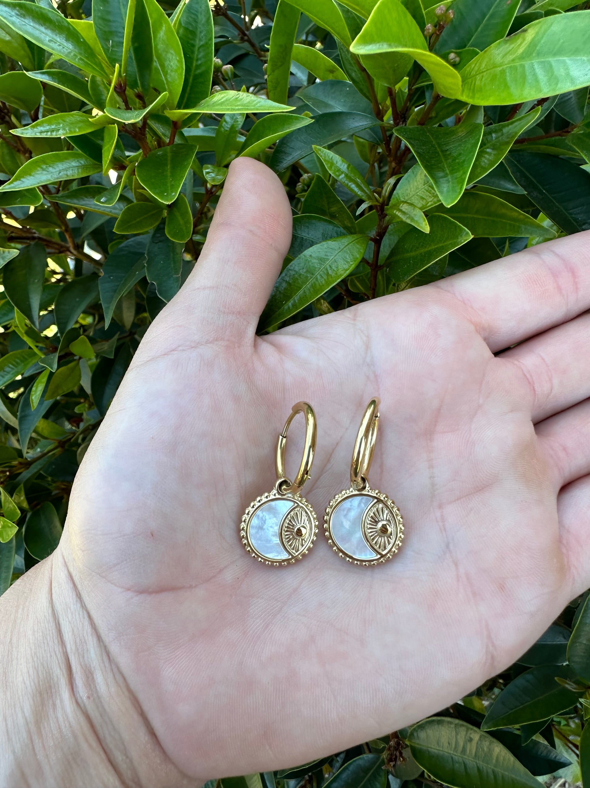 Each earring holds a natural fritillaria stone set & the evil eye , the eye acts as a shield, reflecting the ill-will back onto the onlooker. Featuring 14k gold-plated hoops, pendent is removable from hoops & hoops can be warn alone or with the pendent.