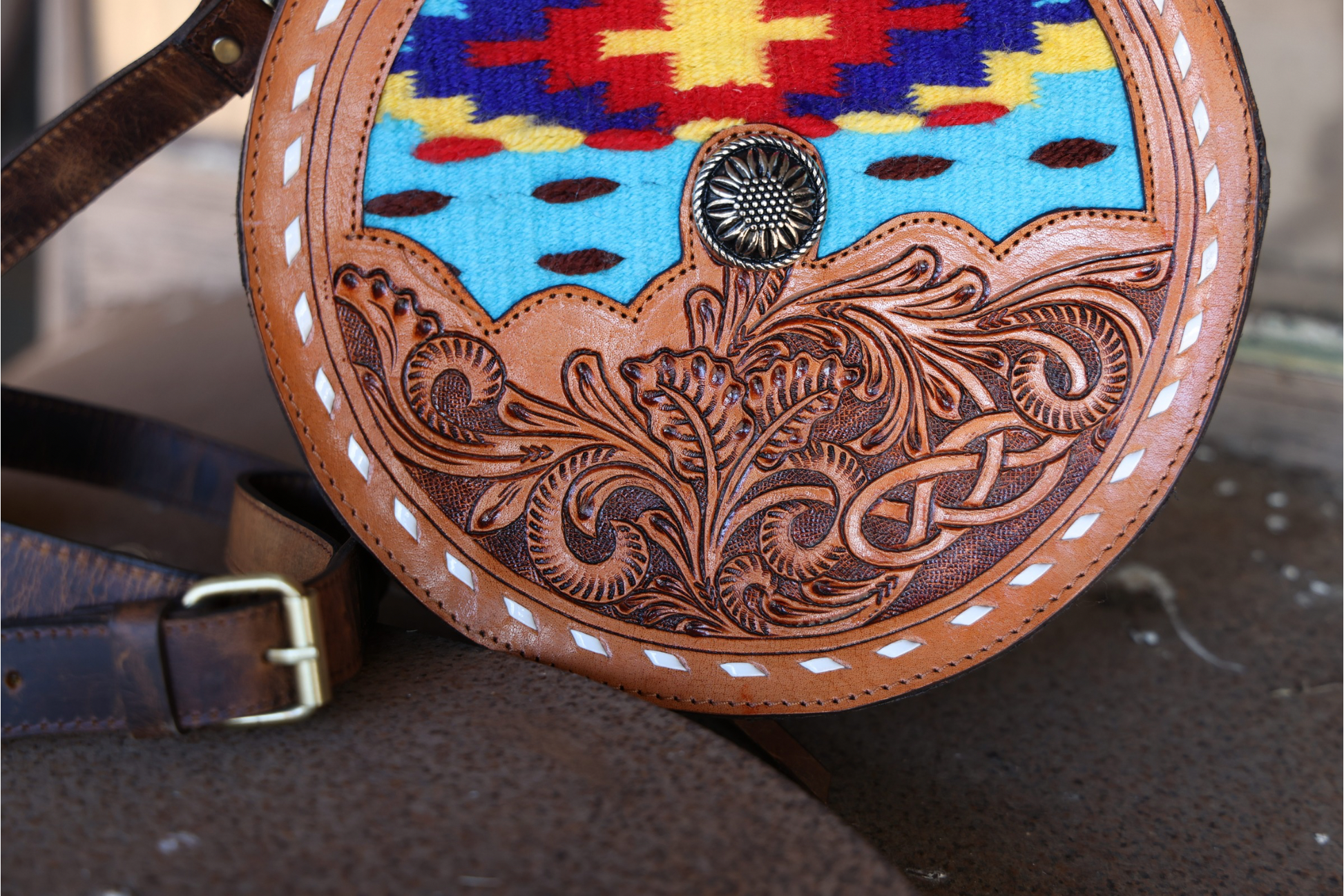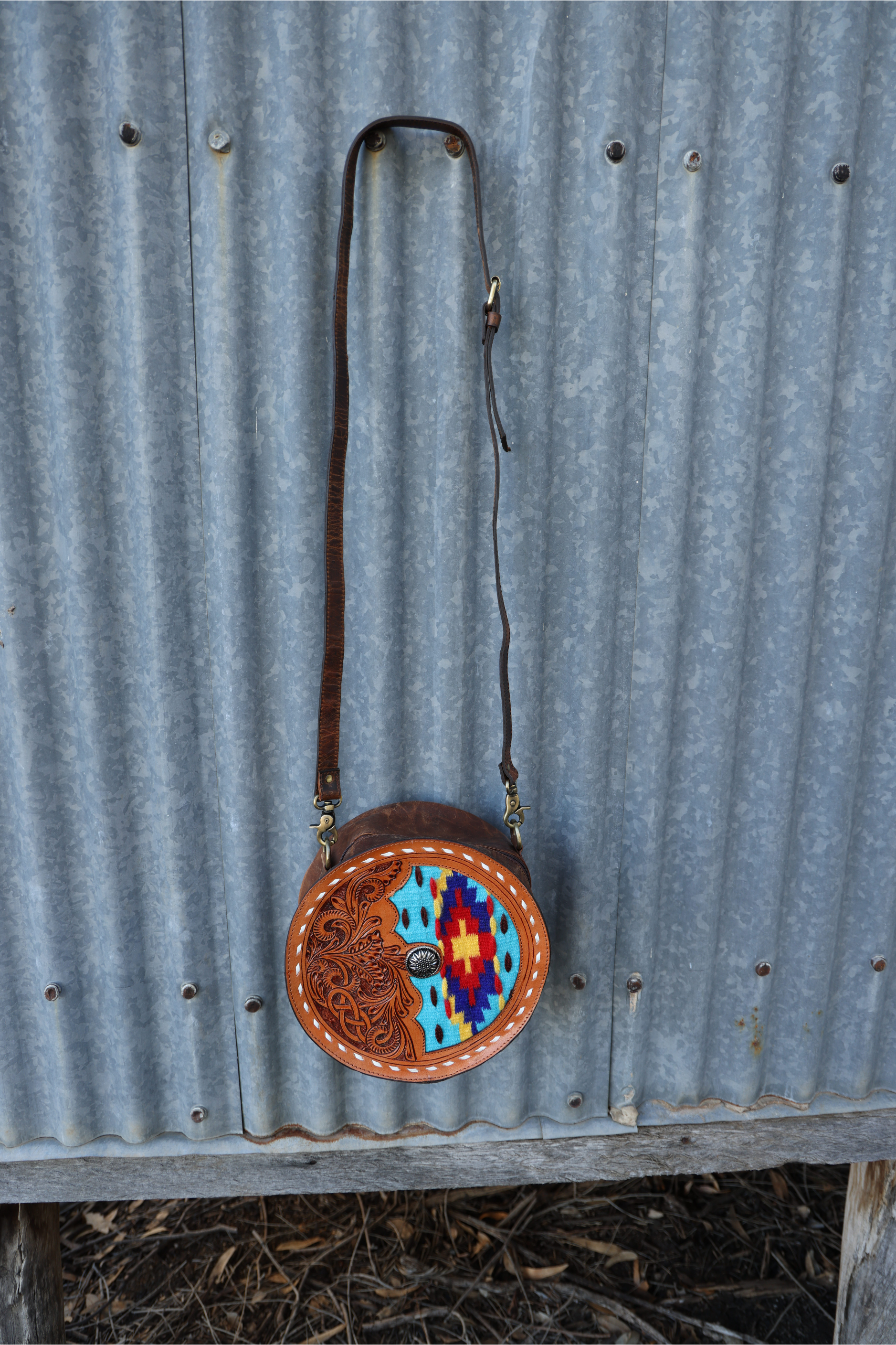 Make a bold statement with this one-of-a-kind round crossbody bag that blends traditional craftsmanship with vibrant Southwestern flair. Featuring hand-tooled leather detailing and a striking woven wool panel, this bag is a true piece of functional art.