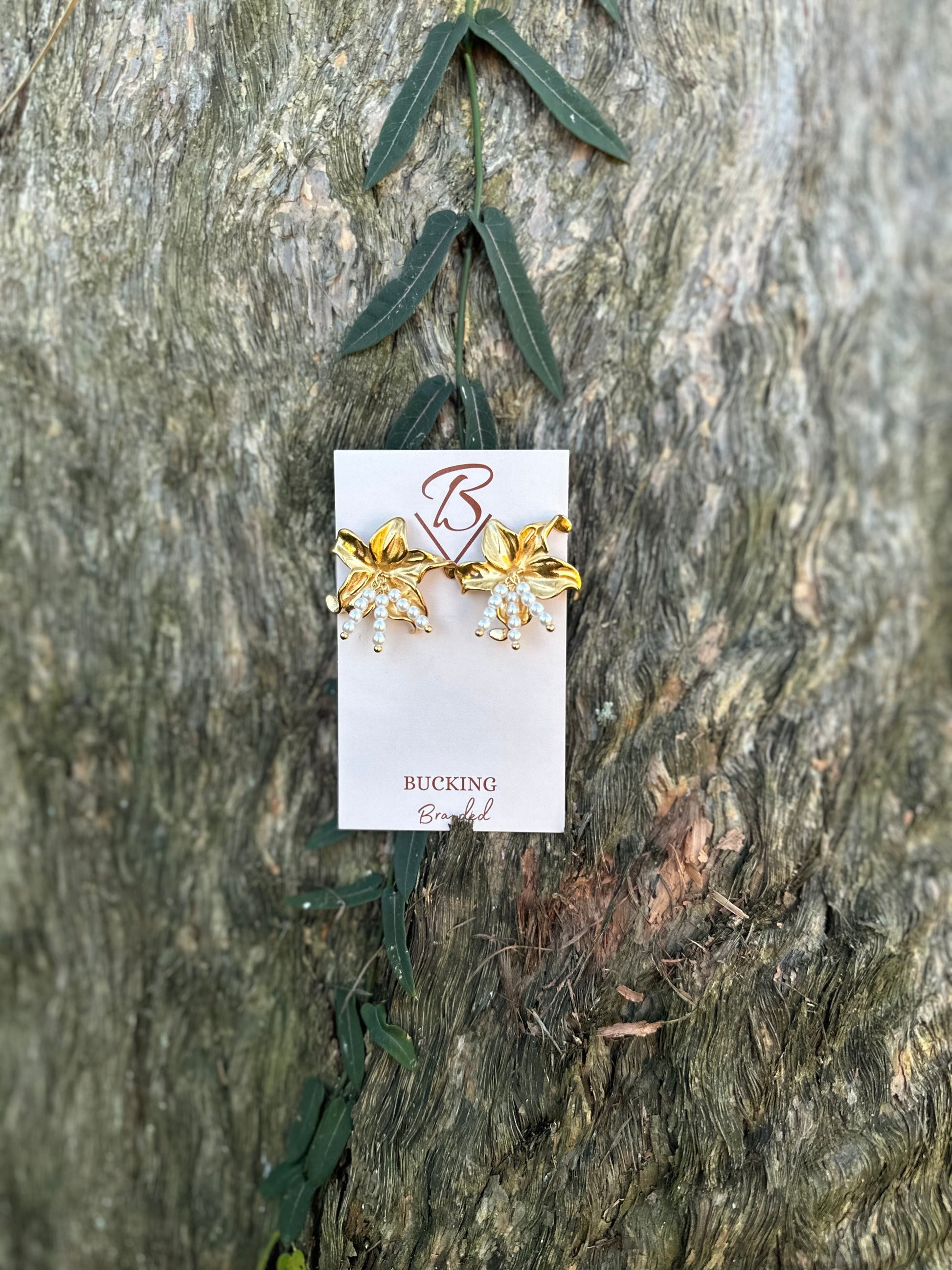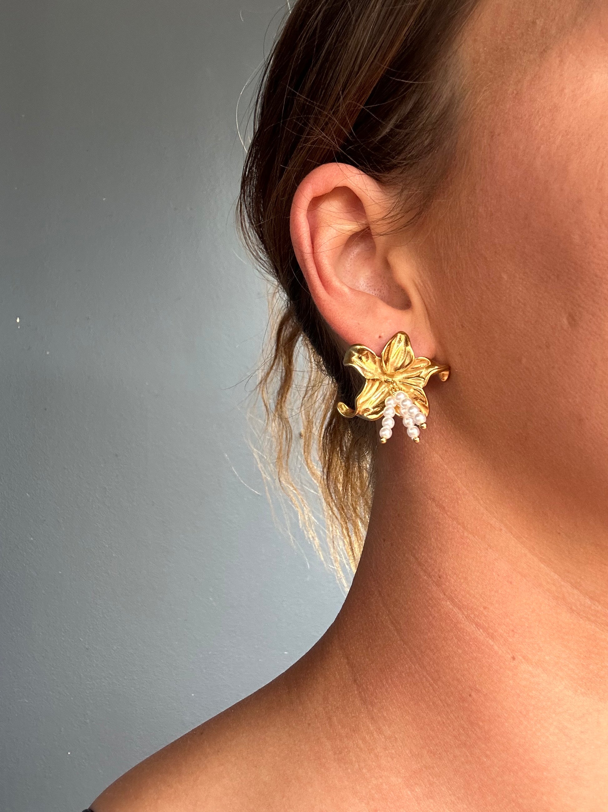 Crafted from a 18k gold-plated, these stud earrings feature five petals, three dangles with four Pearls on each, in their centre.