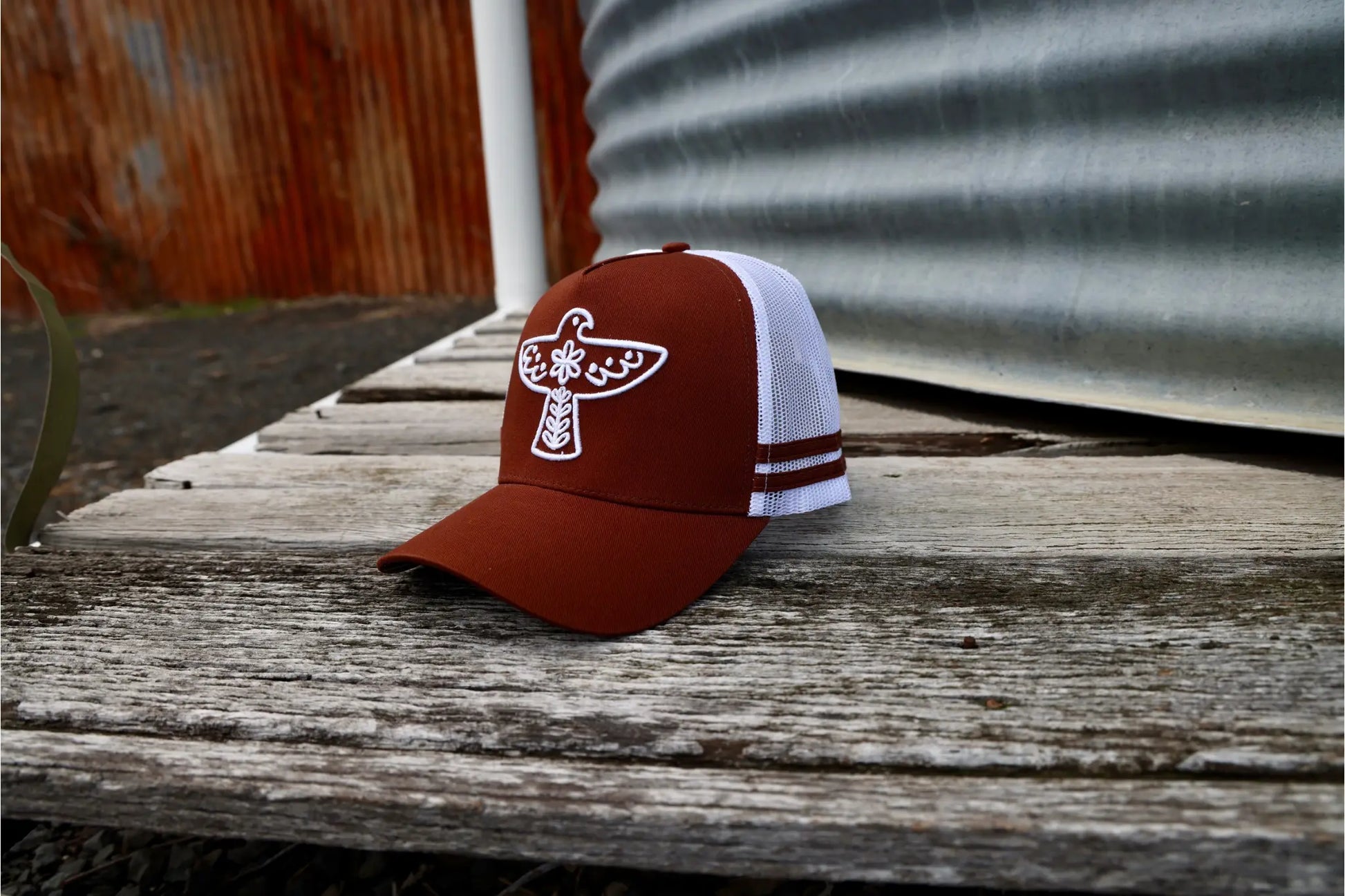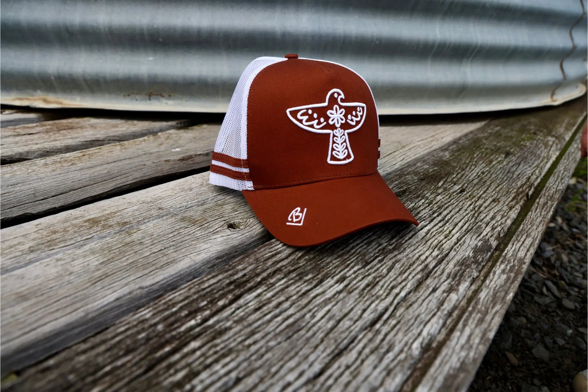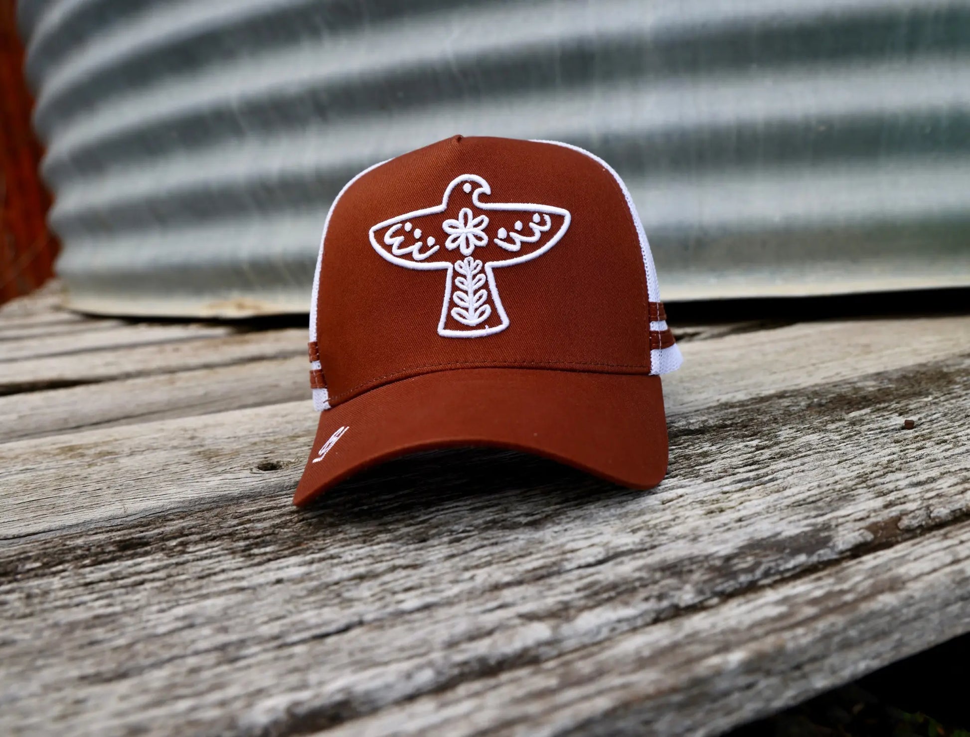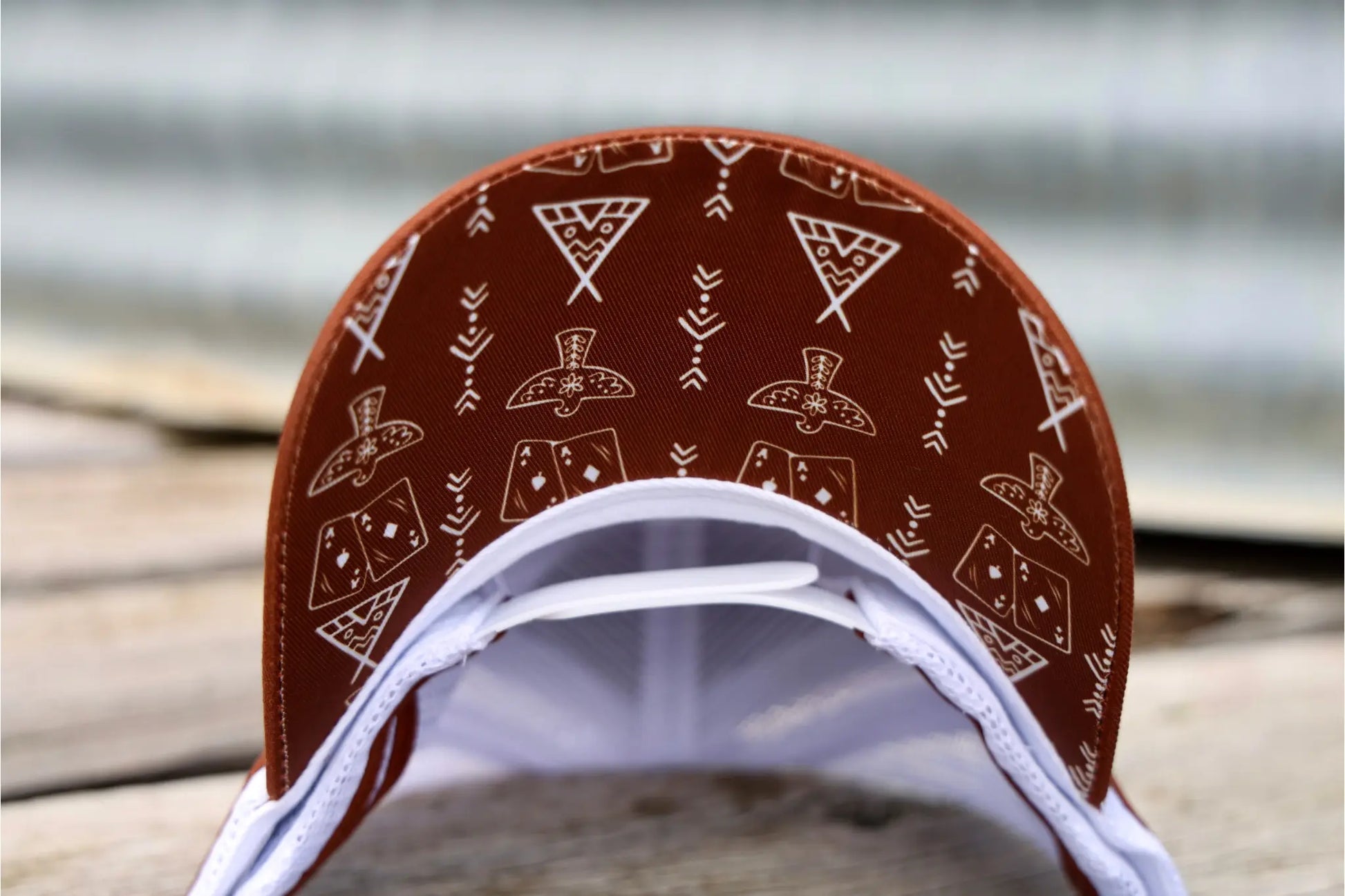Channel the spirit of the Southwest with the Rust Thunderbird Trucker Cap. Featuring a rich rust-colored front and bill, this cap showcases a bold embroidered thunderbird symbol adorned with floral and geometric details. The white mesh back and side stripes add a modern contrast, while the custom-printed underbill surprises with desert-themed illustrations—cowboy hats, dice, arrows, and tribal patterns.